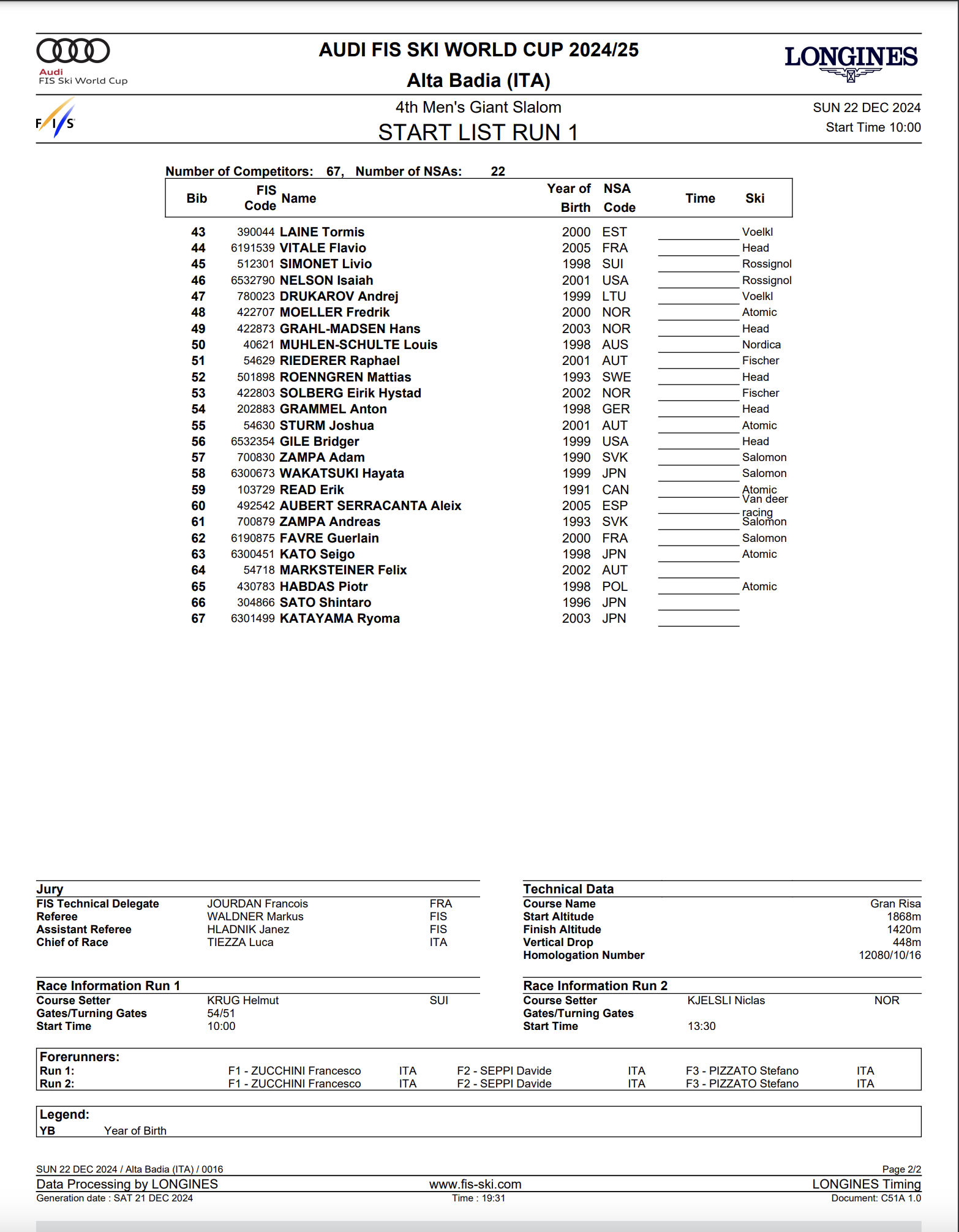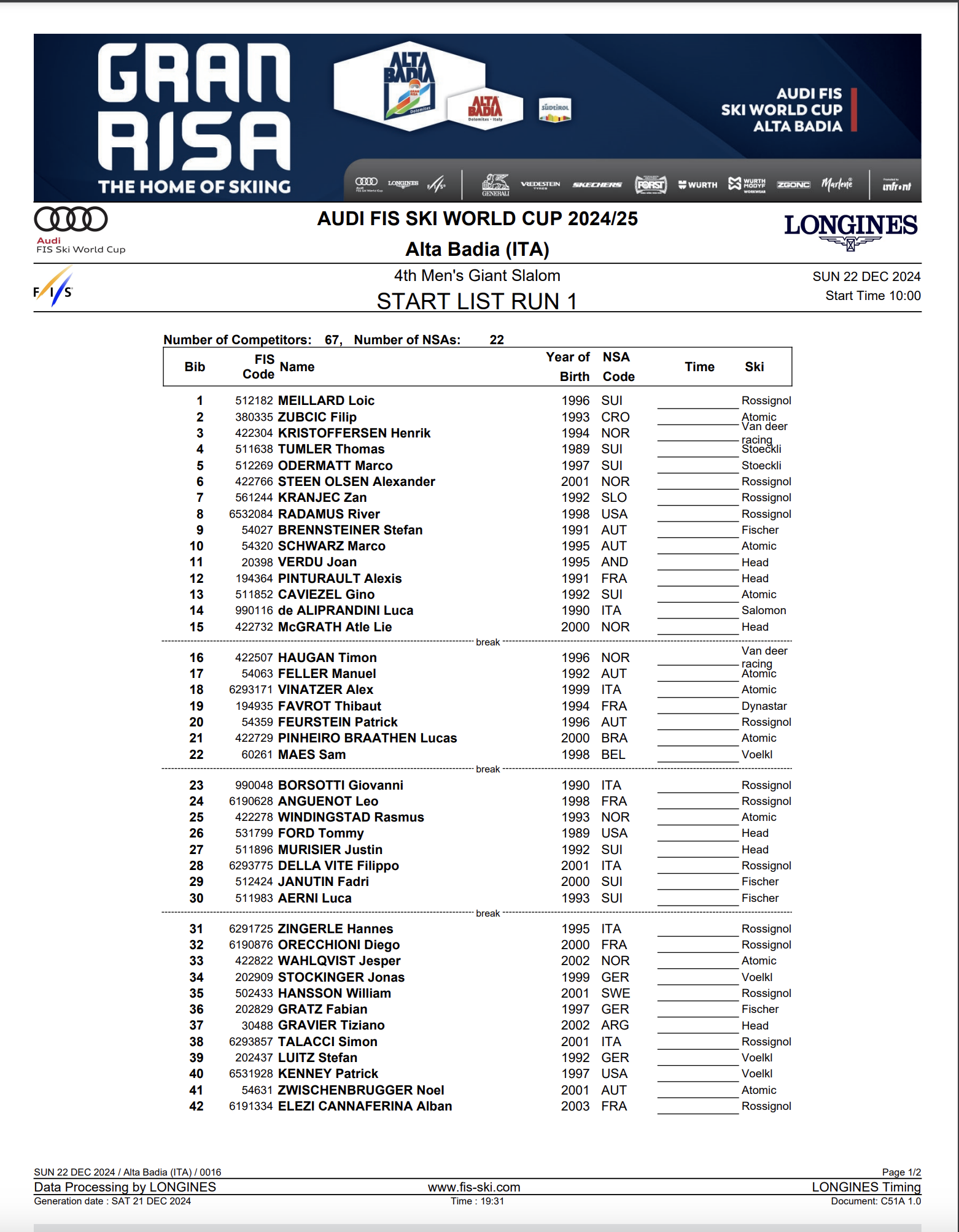 Sixty-seven men from 22 nations will start the men’s World Cup GS in Alta Badia on Dec. 22. Switzerland and Austria lead the field with eight qualified athletes on the start list.