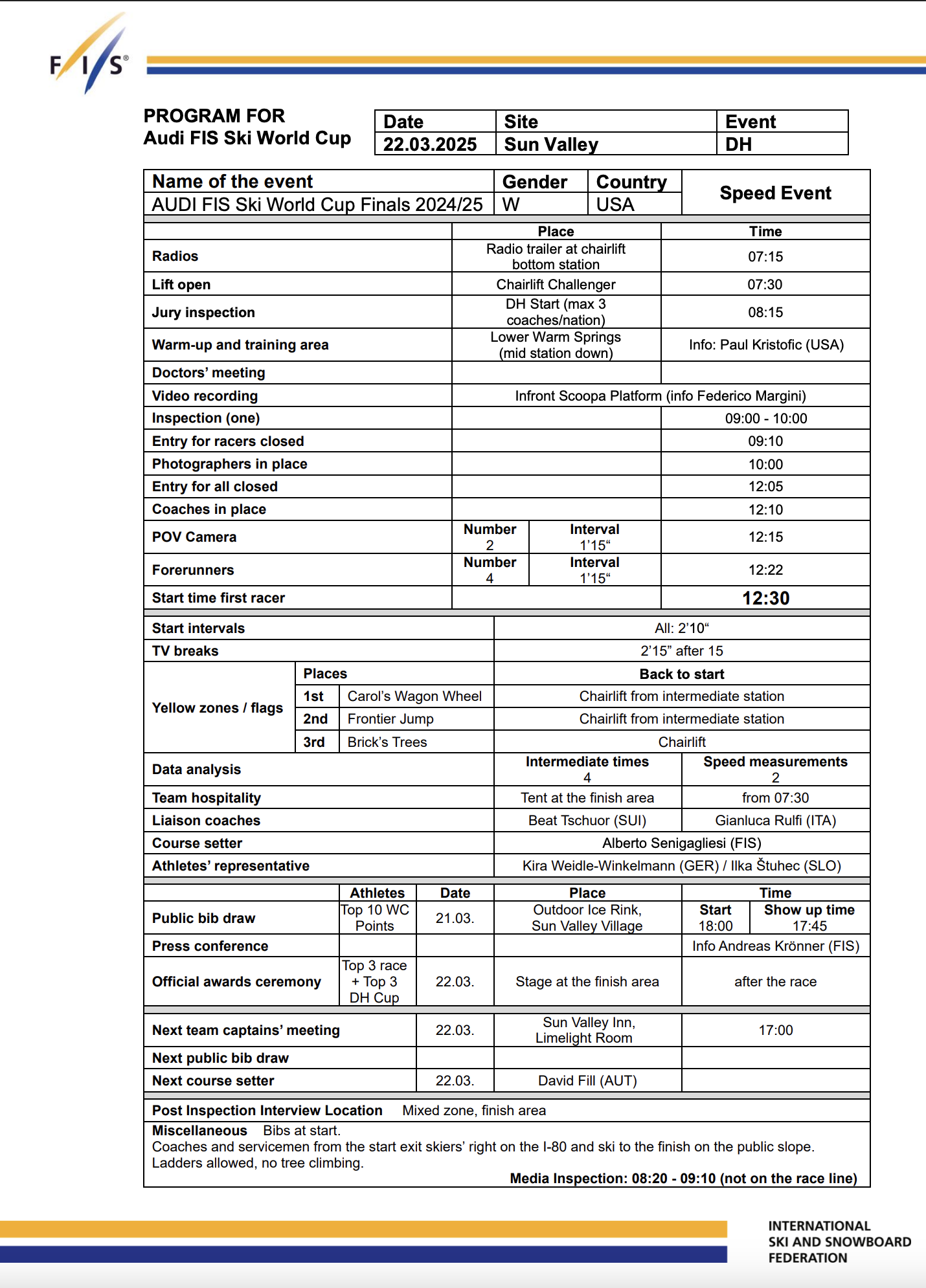 Twenty-four women from nine countries are competing in the downhill at the Stifel Sun Valley World Cup Finals, including New Zealand’s Alice Robinson, who has 668 points during the 2025 season and qualified to race World Cup downhills.