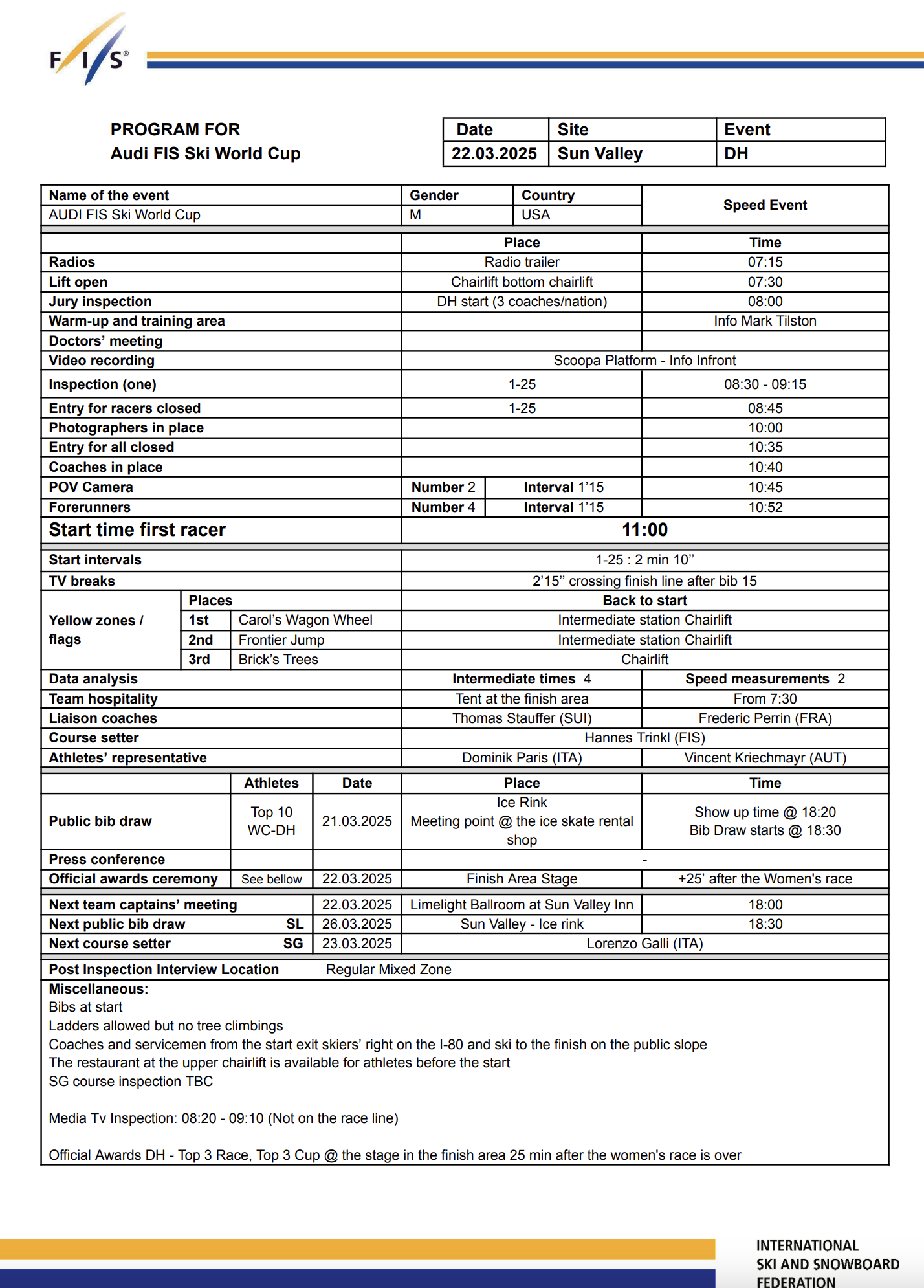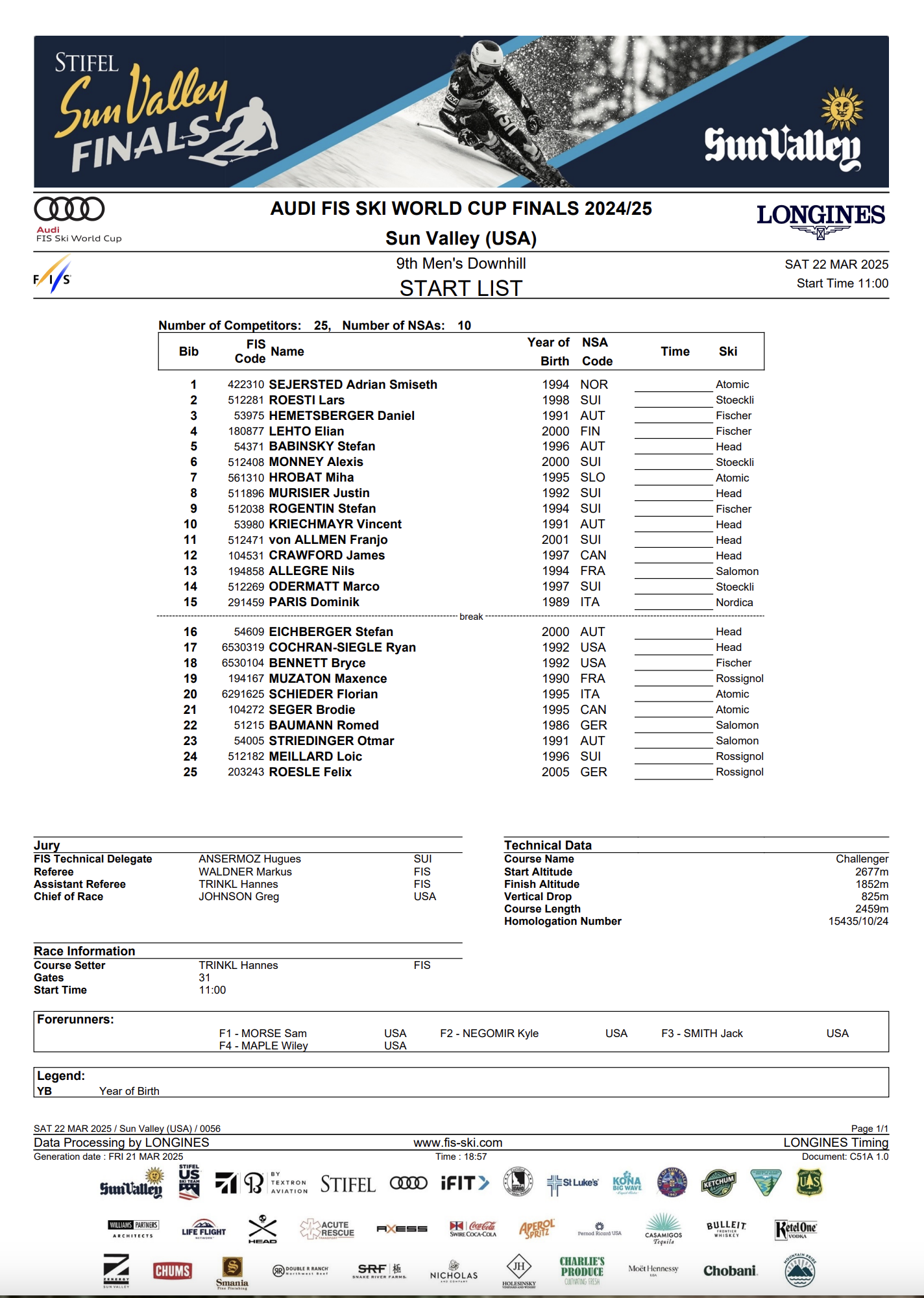 Twenty-five men from 10 countries are competing in the downhill at the Stifel Sun Valley World Cup Finals, including Germany’s Felix Roesle, the reigning Junior World Champion, and Switzerland’s Loïc Meillard, who is eligible to race because he has more than 500 World Cup points. Meillard has 931 points this season and sits third in the overall standings.
