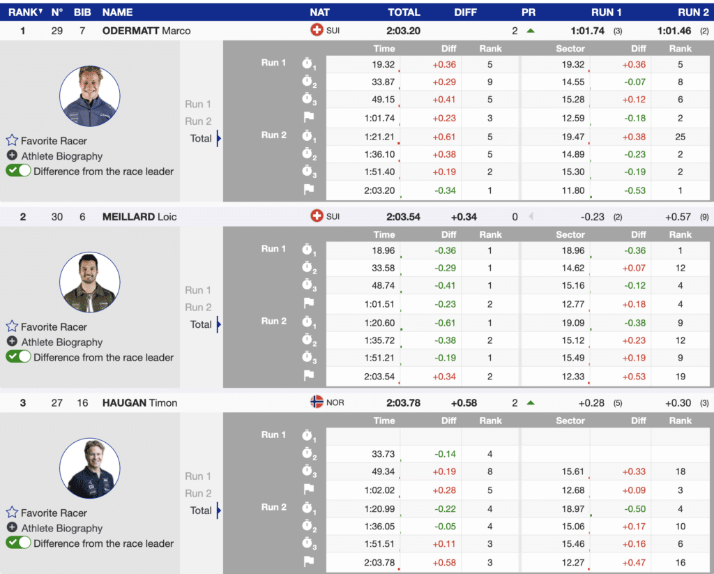 With ten racers left to ski the second run, Italian Alex Vinatzer sat at the top of the standings (0.66) ahead of Switzerland’s Gino Caviezel. However, by delivering the fastest second run, Vinatzer maintained his lead until his teammate Luca De Alipradini, sixth after the first run, assumed the leader’s chair.