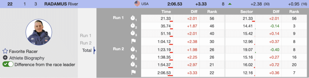Radamus started the second run first because of his earlier first run start number. Typically, when a skier of Radamus’s caliber starts early on the second run, they deliver an excellent performance and make significant progress up the leaderboard. However, today, he couldn’t find his top form. Although he skied well overall, he faced difficulties in the third timing sector. Despite moving up eight positions, it wasn’t the race he had hoped for. However, Radamus finished 22nd and contributed to his season’s point total.