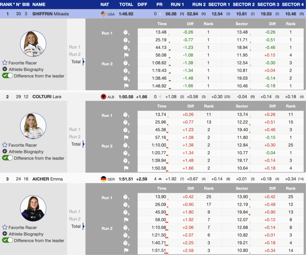 Colturi lit the course on fire with one of the most inspired runs of the day. She attacked from the first gate, carried speed through the steep middle section, and executed world-class timing on the lower pitch. She crossed 0.93 seconds ahead of Aicher, guaranteeing her 13th career World Cup podium and fifth slalom podium.