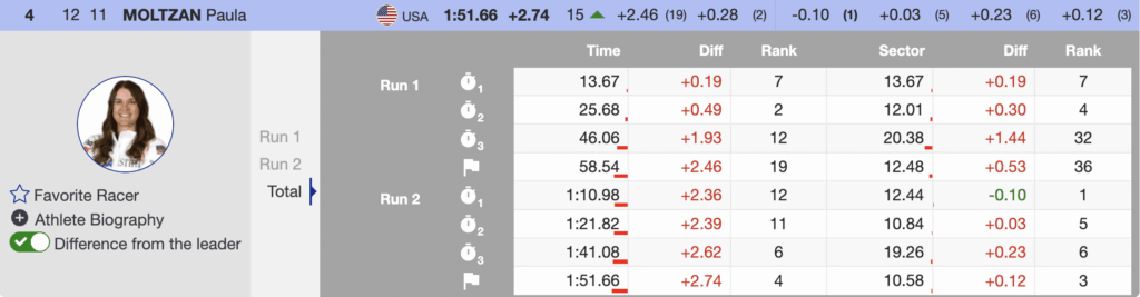 Moltzan started the second run in 19th place and climbed an astonishing 15 positions to finish fourth, missing the podium by just 0.15 seconds. Her run featured the fastest first and fourth sectors and stood as the benchmark for more than half the field.