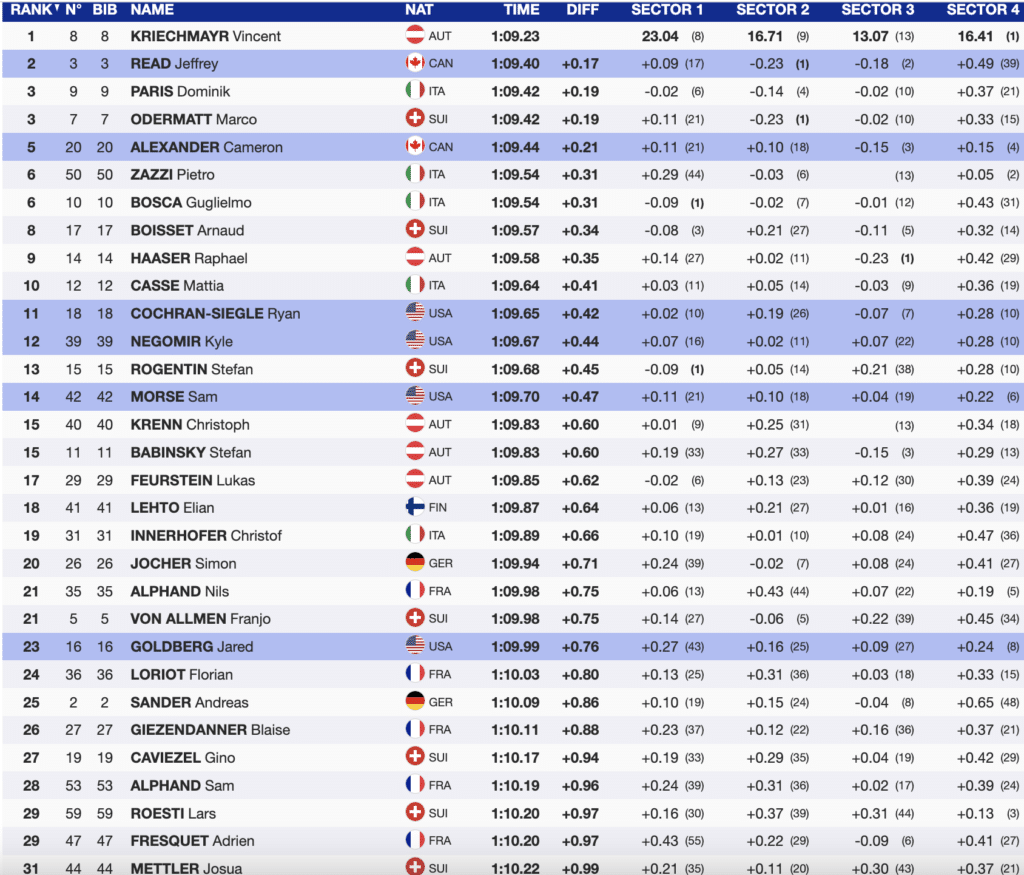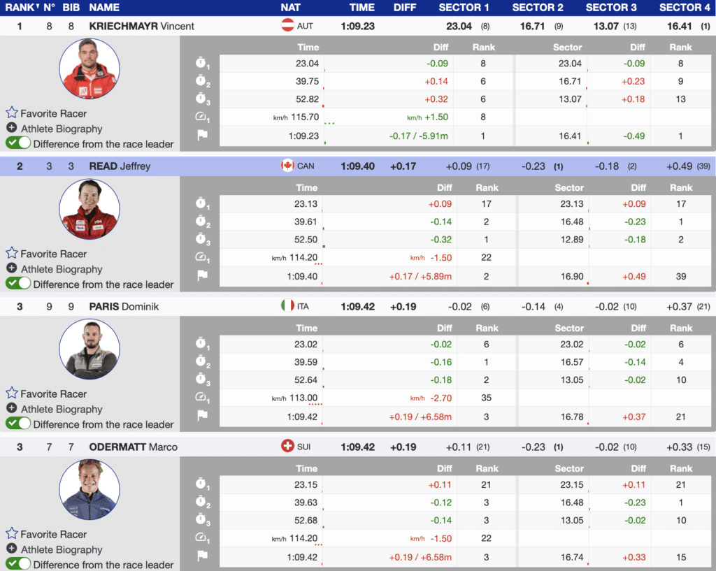 Odermatt sported bib-7 and immediately revealed aggression, looking for more aerodynamics throughout the course. However, with two slight issues in the course’s mid-section, the discipline leader did not finish on top. He came through just +0.02 behind the North American Jeffrey Read.