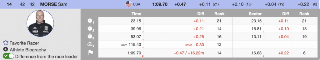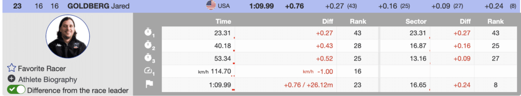 Teammate Jared Goldberg also made it into the top 30. He executed a composed run but lost some time in the final section of the track, finishing in 23rd place.