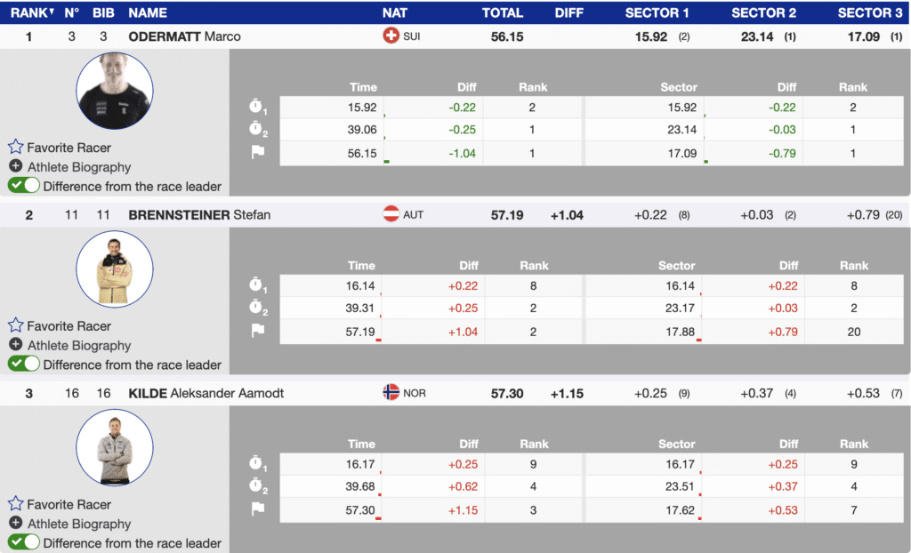 However, behind Odermatt, the field was tight. The time separation from the 2nd to the 13th position is (0.63). The competition for the podium positions will be exciting during the final run and will include many racers. There are 21 racers less than a second out of second place.