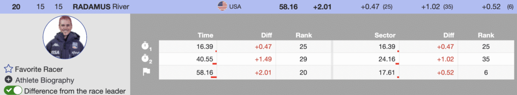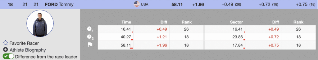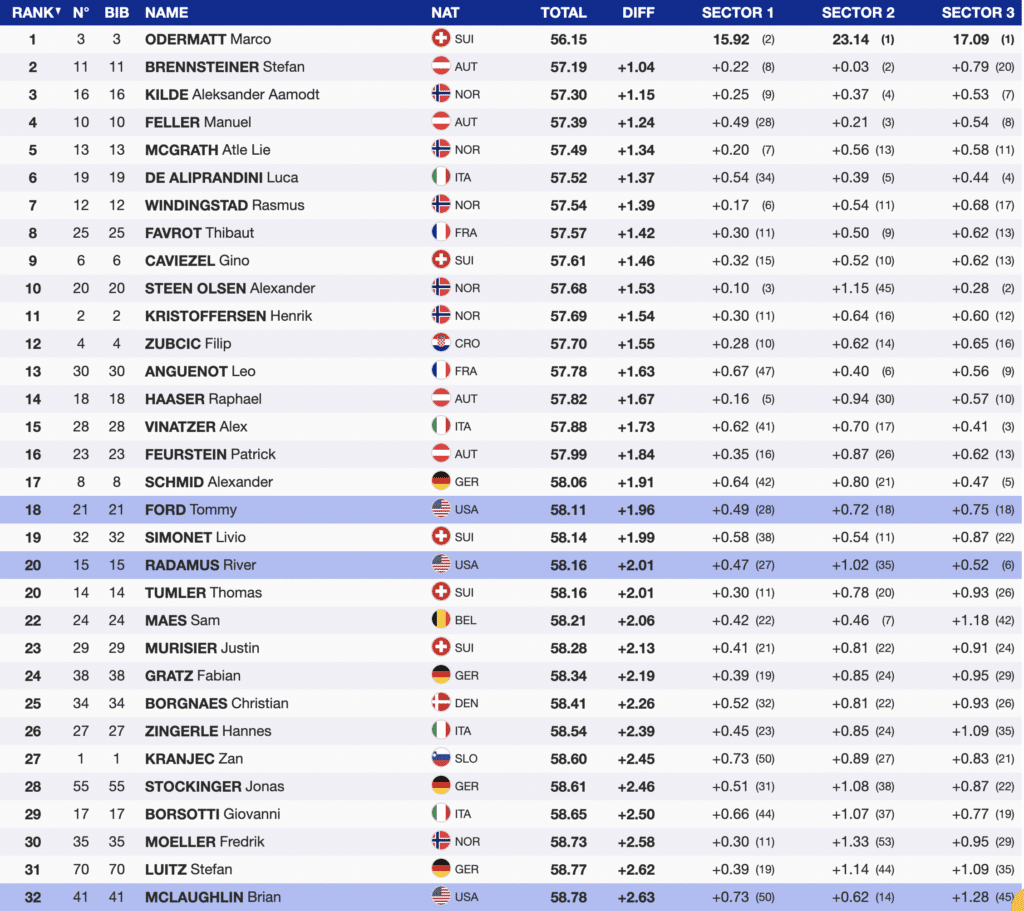 The veteran Tommy Ford was the fastest Stifel US Ski Team member during the first run. Ford finished 18th (+1.96), slower than Odermatt but only (0.92) behind second place Brennsteiner. Two places behind him is his teammate River Radamus, who tied for 20th and only (+0.97) out of second. Both men can end the day standing on the podium if they deliver their best during the second run.