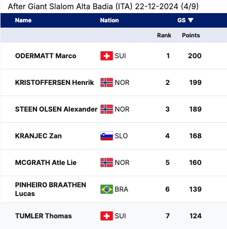 - Alta Badia, Italy: Odermatt secured another victory, France’s Léo Anguenot finished 2nd, and Steen Olsen claimed 3rd.