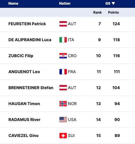 Top 15 Men’s 2014-25 GS World Cup Standings