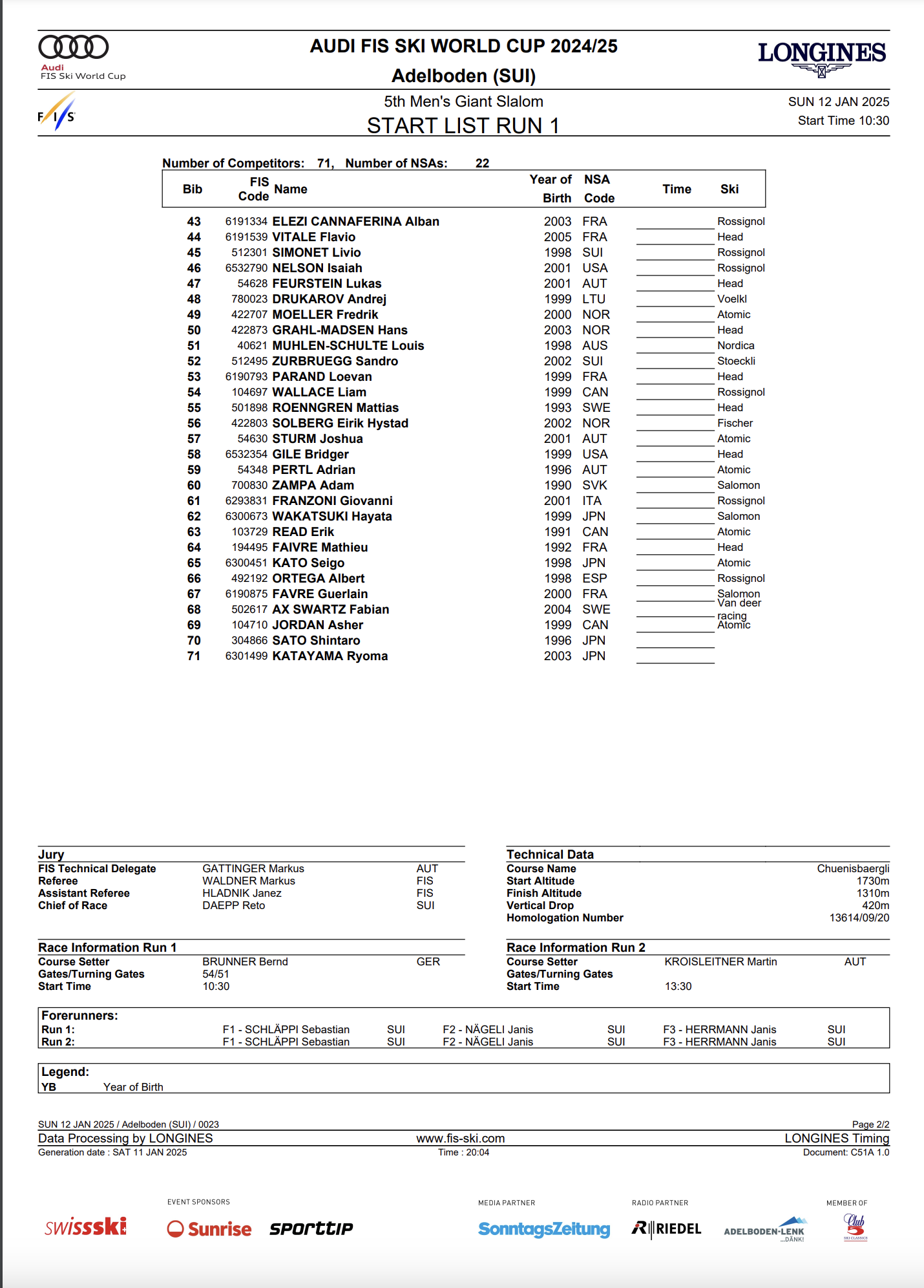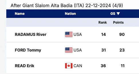 Veteran Erik Read leads the Canadian roster after scoring his first points of the season with a 20th-place finish in Alta Badia. Read has extensive experience on the Chuenisbärgli, scoring in five of his GS starts here. Liam Wallace and Jordan Asher will join him. Despite 29 World Cup starts, Wallace is still chasing his first points, while Asher scored a career-best 20th in Kranjska Gora in 2023.