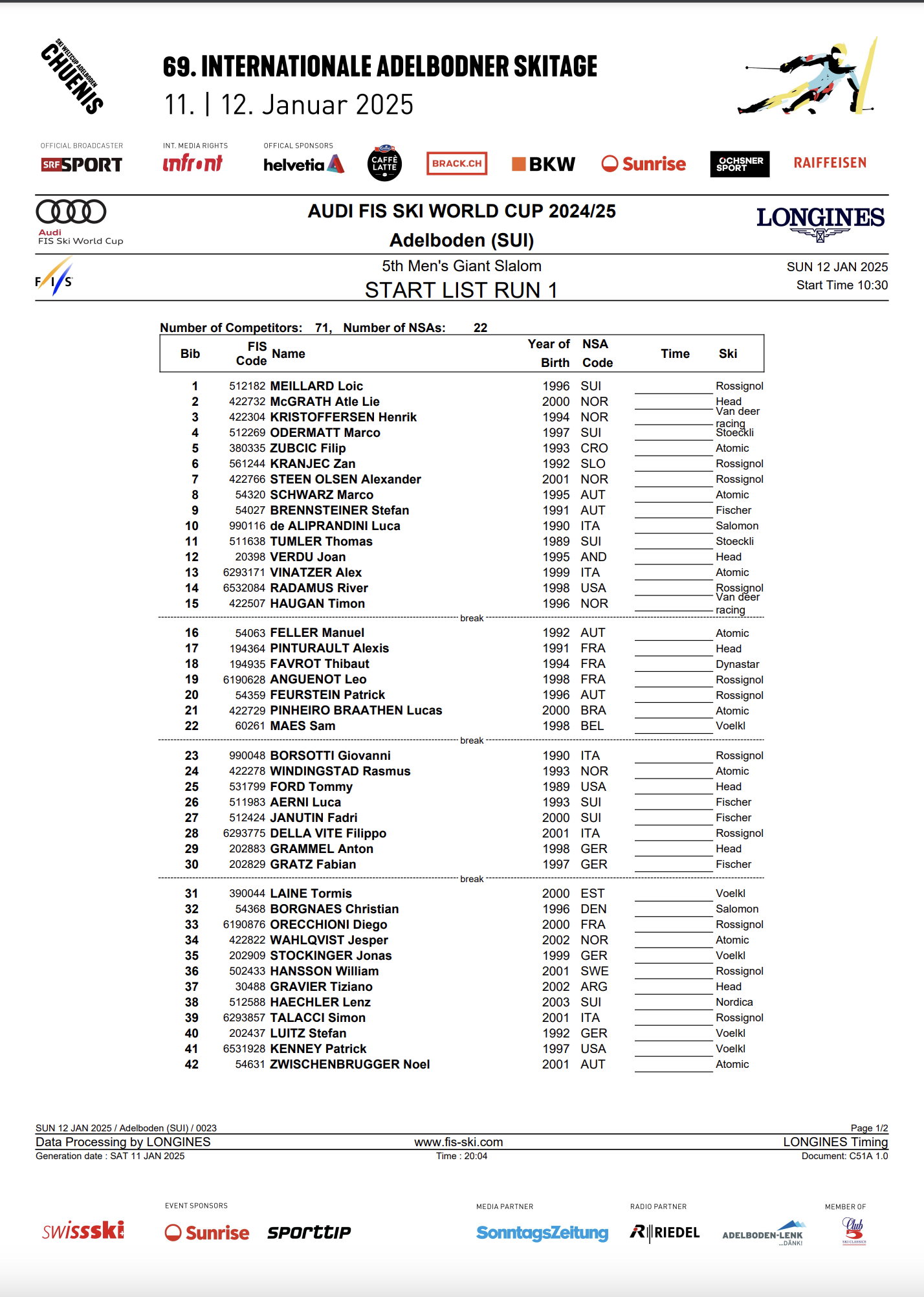 Seventy-one men from 22 nations are set to compete in the Men’s World Cup Giant Slalom in Adelboden on Jan. 11. Switzerland and Austria top the entries, each fielding eight qualified athletes.