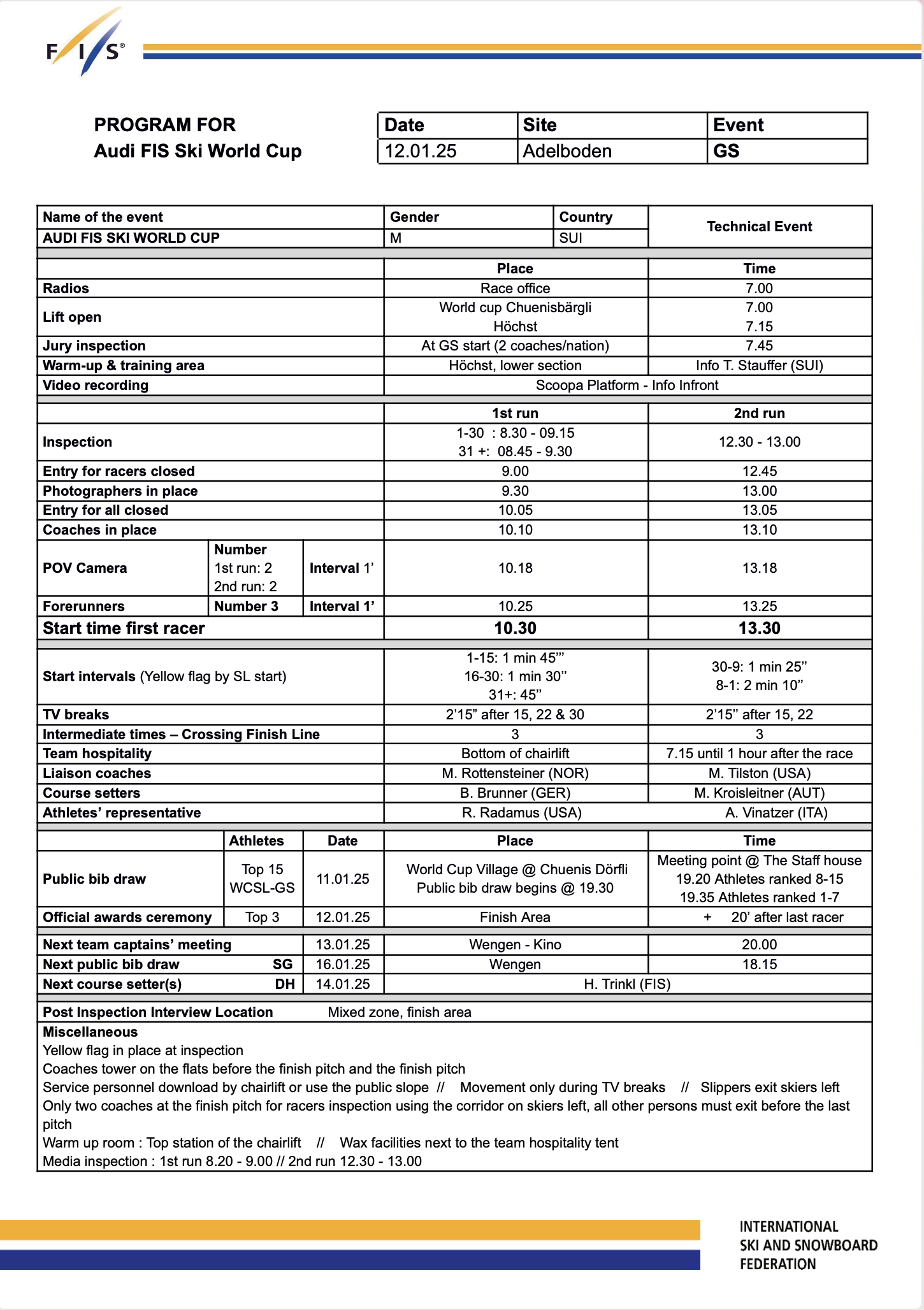 Tommy Ford, the only active U.S. man with a World Cup GS victory, is eager to improve his 17th-place finish in last year’s Adelboden GS. Both aiming for their first World Cup points, Bridger Gile and Isaiah Nelson look to make a breakthrough on this challenging course. Patrick Kenney, who qualified for the second run in Beaver Creek but did not finish, hopes to complete both runs in Adelboden and secure his first points of the 2024-25 season.