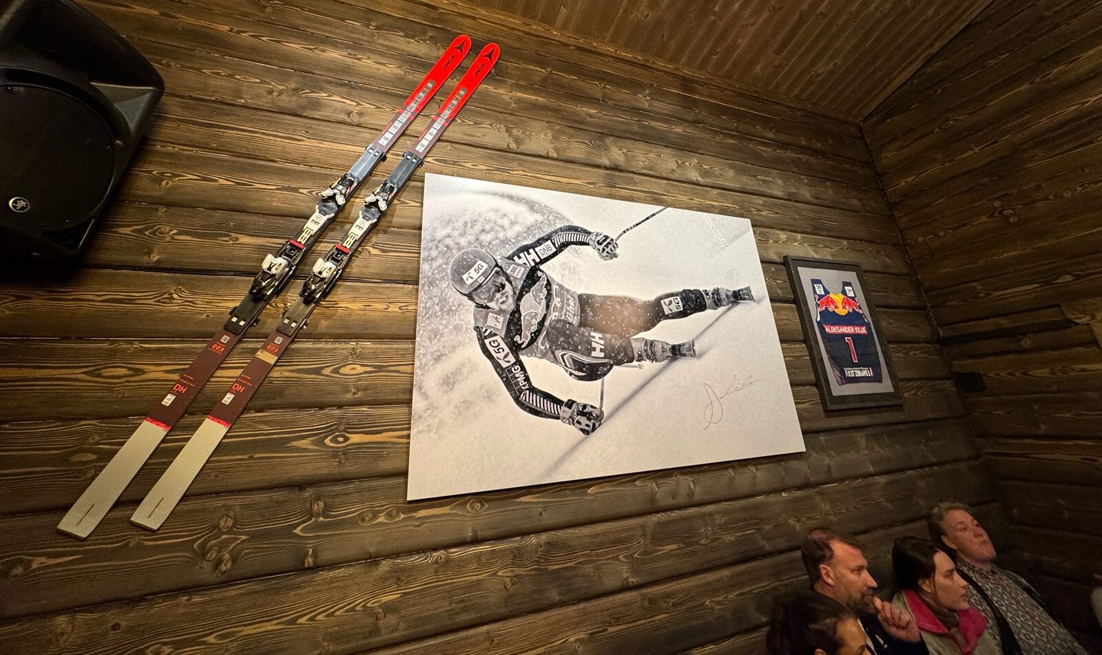 The wall displays a large action photo from the Hahnenkamm race in Kitzbühel, his Kitzbühel race bib, and a pair of Atomic downhill skis – all donated by Aamodt Kilde.