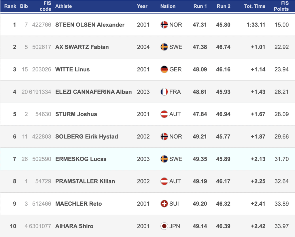 Norway’s Alexander Steen Olsen is the back-to-back junior world champion after his slalom victory on Wednesday. After sitting out the speed events and alpine combined, Steen Olsen capitalized on his recent Europa Cup momentum for double gold in the technical events.
