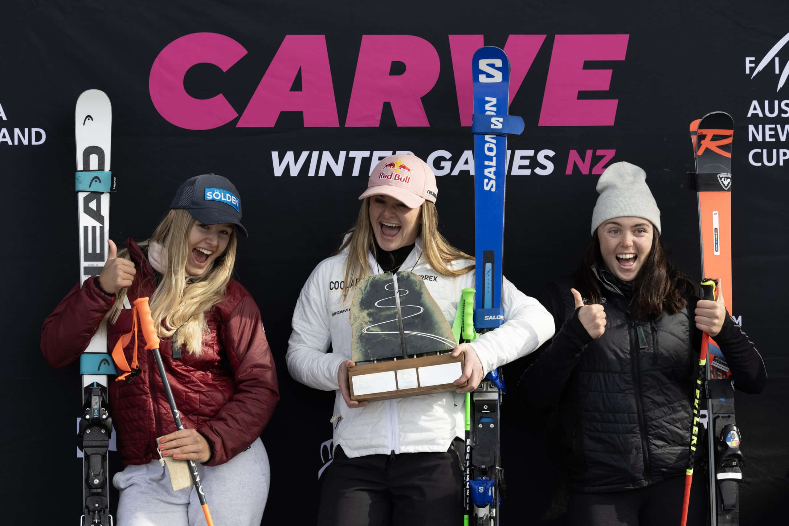 Podium from the FIS Giant Slalom Australia New Zealand Cup 2024, Photo: Winter Games NZ