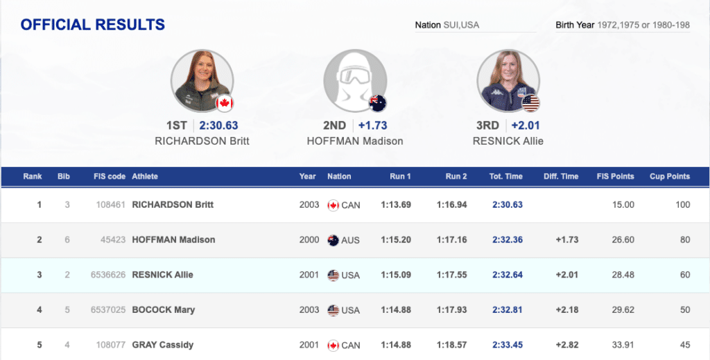On Monday, Richardson quickly set the pace with the fastest first run and a lead over a second. Gray and U.S. Stifel member Mary Bocock were tied, with a stacked field close behind. On the second run, Richardson extended her lead to win the race by (-1.73) seconds. Madison Hoffman, skiing for the University of Utah, had a stellar comeback run, finishing second on the day. Allie Resnick finished third for the U.S.