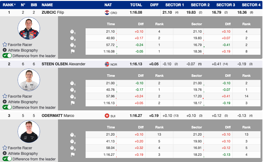 Noreweigan Alexander Steen Olsen heads into the second run just +0.05 behind Zubcic and Marco Odermatt sits in third +0.19 behind the pace.