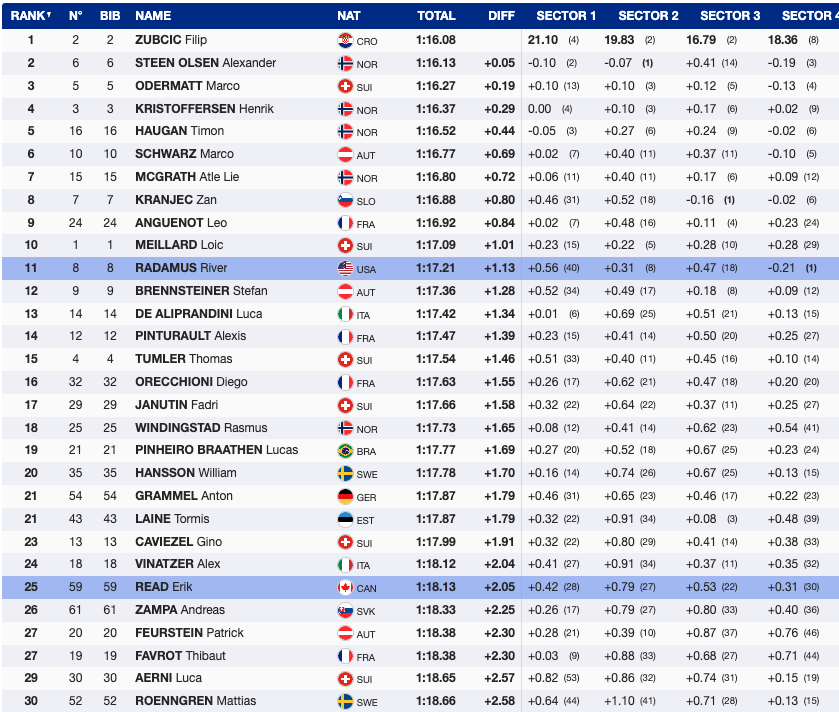 Nonetheless, seven racers outside of the top 30 qualified for the second run, and the quickest among them was Diego Orecchioni in bib 32. He’s sitting at +1.55 behind the leader, but he’s close to cracking the top 15.