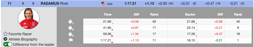 River Radamus was looking slightly hesitant on the first few turns, but after the big left footer, he found a rhythm through the middle section. After picking up the pace through the final turns, Radamus sits +1.13 off Zubcic’s pace, but only +0.12 outside of a top-10 result.