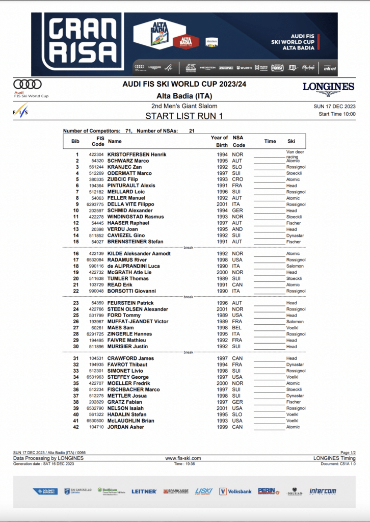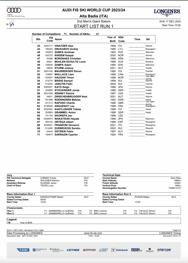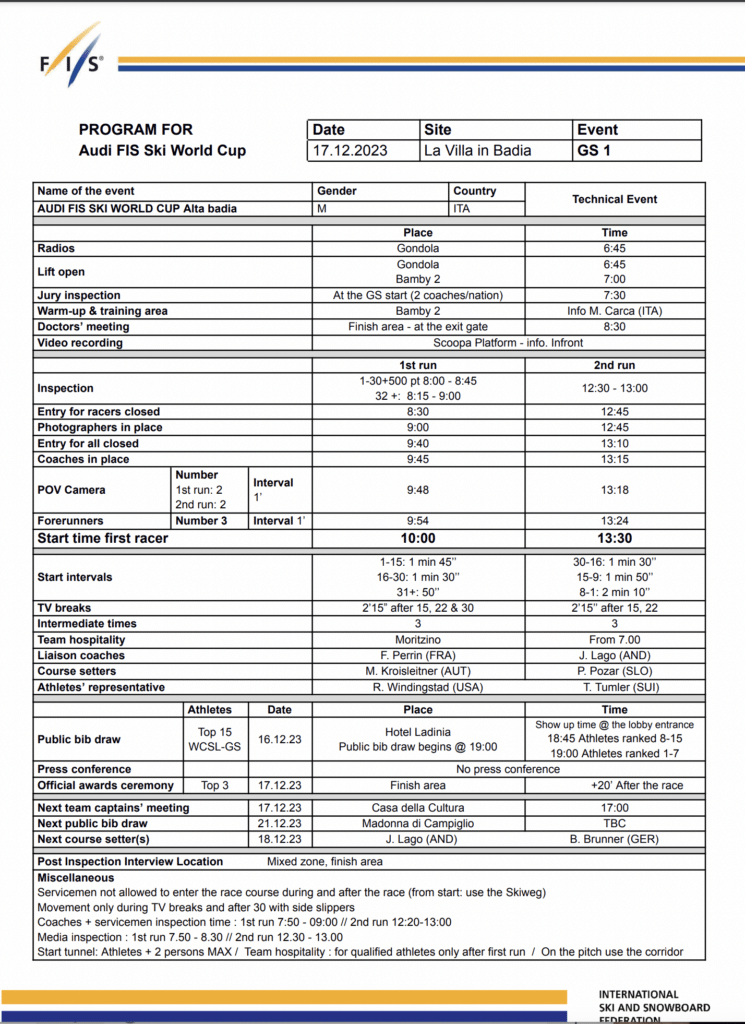 Start list and program for the Sunday, December 17th Alta Badia Giant Slalom