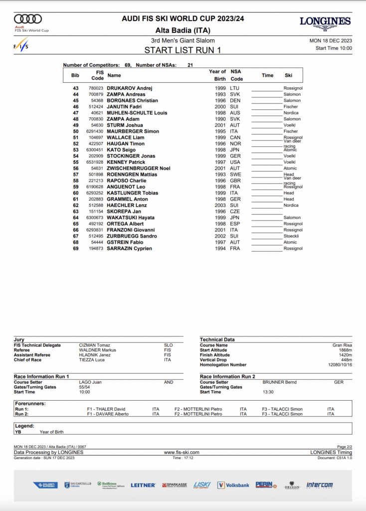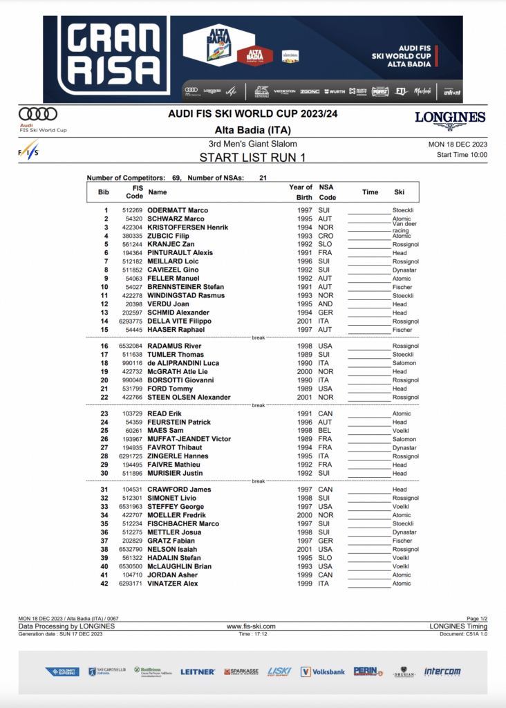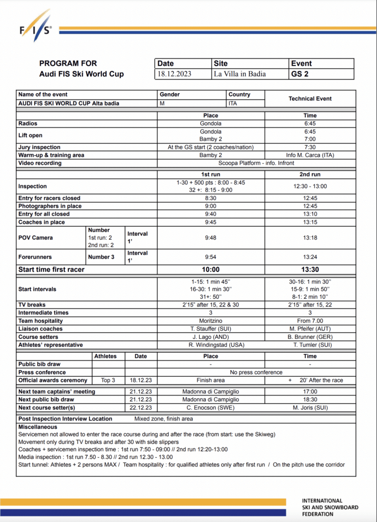 Start list and program for the Monday, December 18th Alta Badia Giant Slalom
