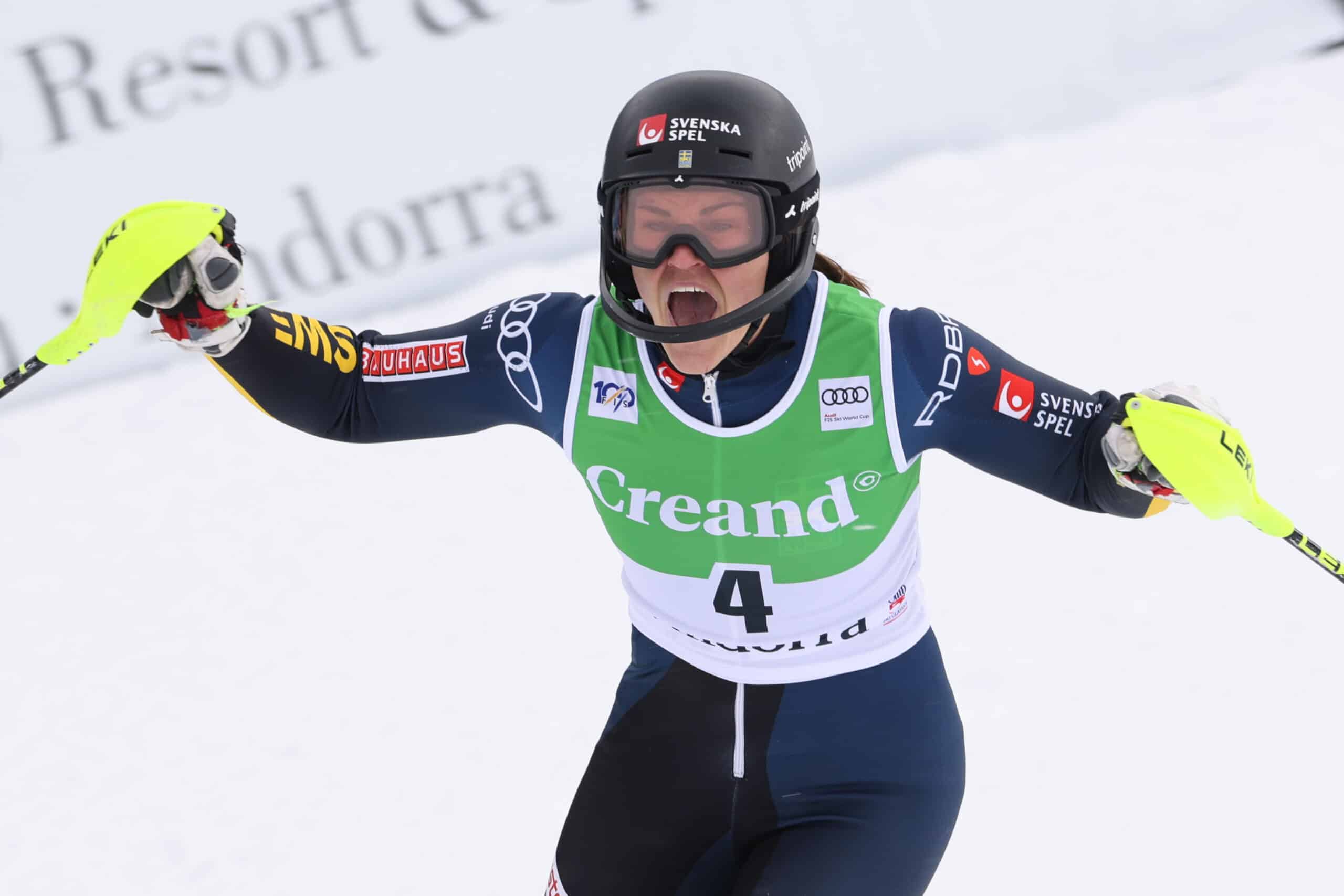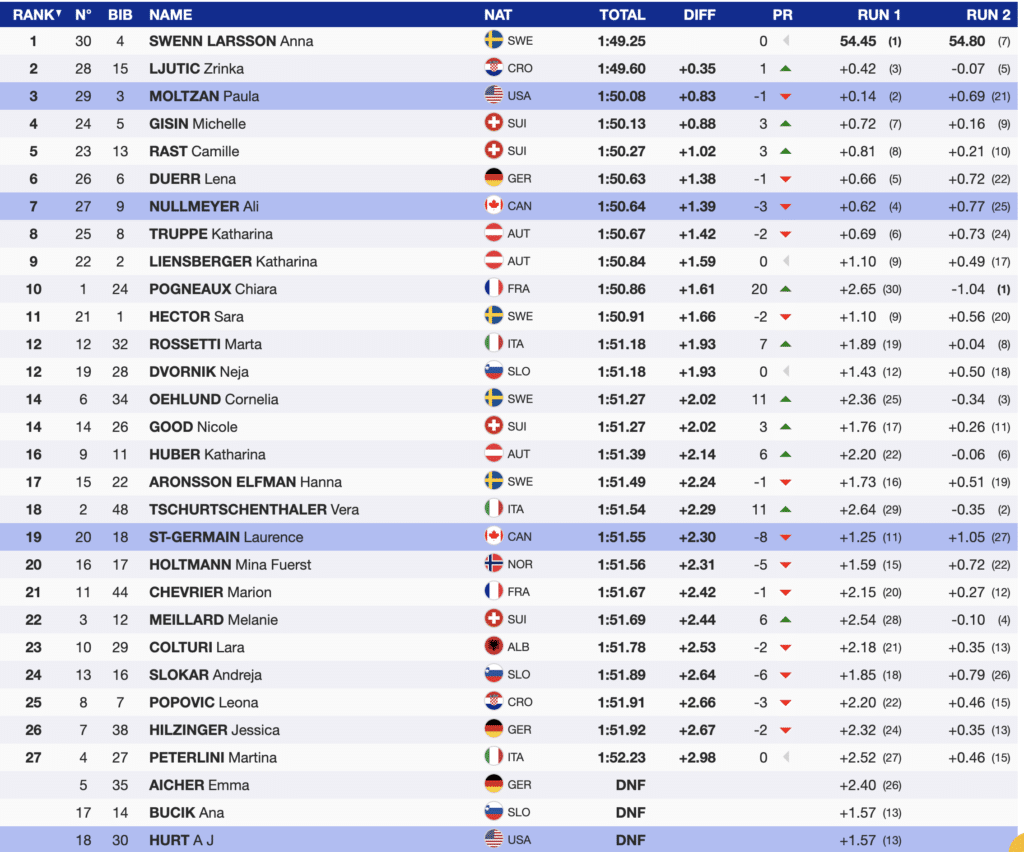 It was then time for Sweden’s first run leader, Anna Swenn Larsson, and she outclassed them all. Using the 7th fastest second run, she wins her second career slalom.