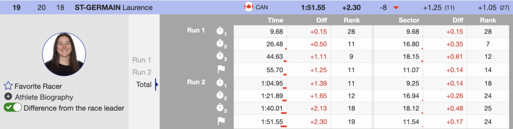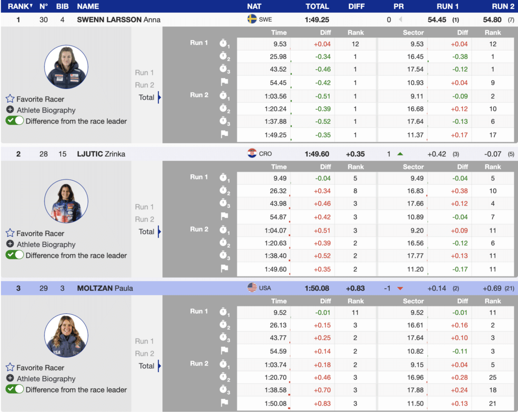The first skier to attack the second run was France’s Chiara Pogneaux. The field had a much easier time finding the speed of the afternoon course, and Pogneaux made it look easy. She assumed the leader’s throne and didn’t relinquish its comfort for the next 20 racers. After 15 skiers had completed their final run, she had a (+0.32) over Italy’s Marta Rossetti. She had the fastest second run and ended the day in 10th.