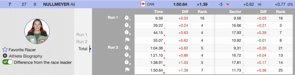 The second North American to ski was the reigning World Champion from Canada, Laurence St-Germain, who was injured most of the season. She produced a solid first run but then struggled during the second. St-Germain ended the day in 19th. Her teammate Ali Nullmeyer also struggled to find speed on the second run but used her great first run to finish 7th.