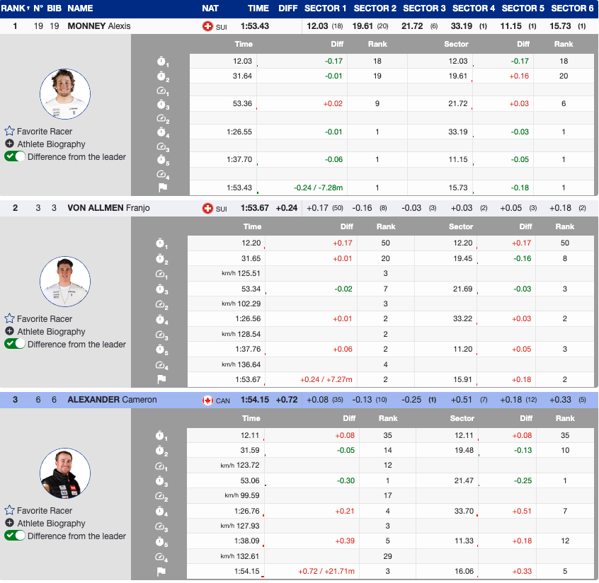 Monney maintained composure and confidence through these critical sections and nailed the final technical turns. As he came through the finish, he bumped his teammate, Franjo Von Allmen, off of the leader’s chair.