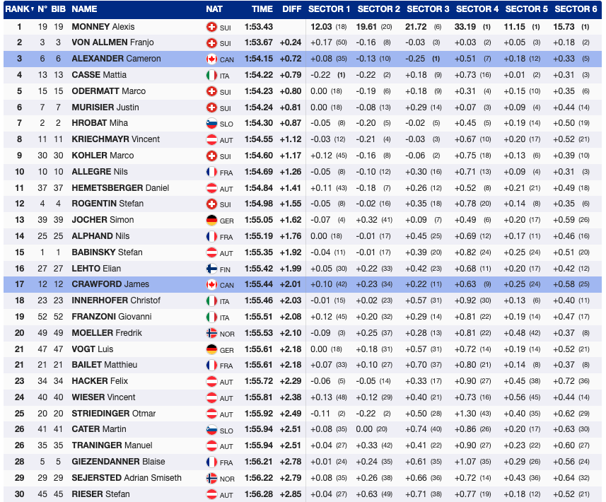The 24-year-old athlete, Alexis Monney, threw down an impressive performance, earning his first World Cup victory of his career. Before this event, Monney’s top downhill result was last season in Kitzbühel where he achieved 8th place.
