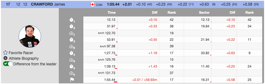 Crawford was ranked 9th in the downhill World Cup standings coming into the Bormio event. He began the season with a stellar 4th place finish on the Bird of Prey in Beaver Creek but could not secure a top-30 result in Val Gardena. Thereby, Crawford was looking to get back into leaderboard contention in this event.