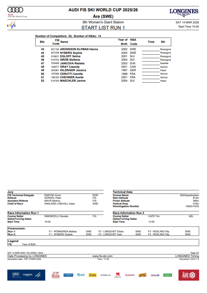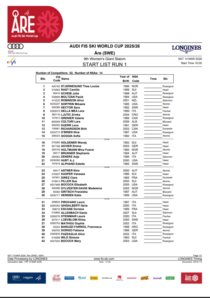 The FIS Ski World Cup heads to Åre, Sweden, for the ninth women’s giant slalom of the 2025–26 season on the Störtloppsbacken slope. This article includes how and when to watch, the full first-run start list, daily program, field analysis, and discipline standings context, along with a look at athletes from the Stifel U.S. Ski Team and Alpine Canada as the race helps determine the World Cup giant slalom title and qualification for the World Cup Finals in Hafjell, Norway.