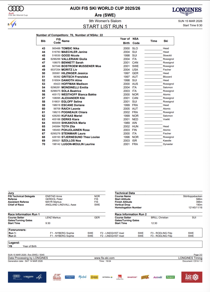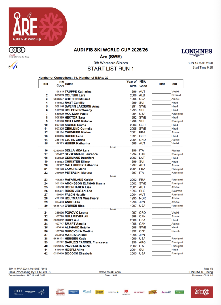 In this article, you will find how and when to watch, the full Åre women’s slalom start list, field analysis, season standings, and key contenders, including the athletes most likely to challenge for the podium.