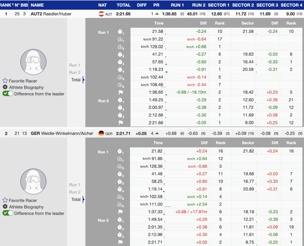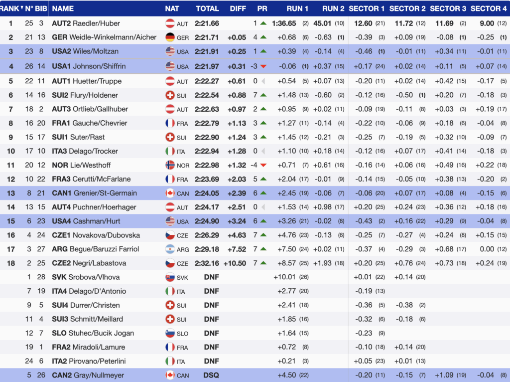 - 5th 🇦🇹 AUT1 — Cornelia Hütter (1992) / Katharina Truppe (1996) — +0.61