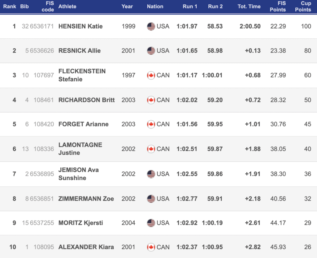 In the first run, Stefanie Fleckenstein led for Alpine Canada while Hensien made a move from bib 32 into fifth. Teammate Allie Resnick was just ahead of Hensien in fourth behind a stacked field of Canadian skiers. In the second run, both Hensien and Resnick stepped up to extend ahead of Fleckenstein, finishing first and second.