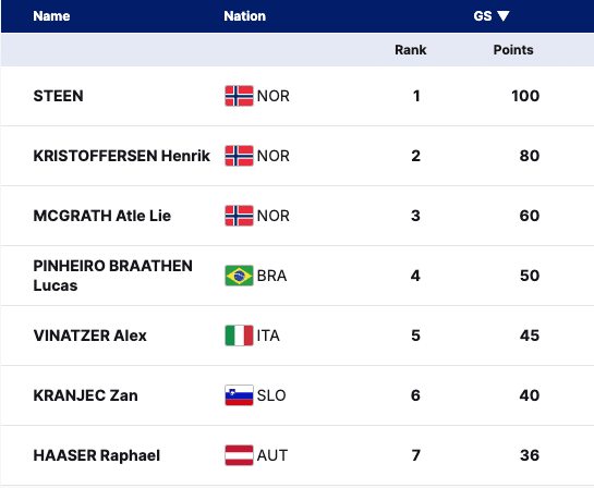 Alexander Steen Olsen, a rising 23-year-old, claimed his first GS victory in a standout performance. He narrowly defeated his experienced teammate Henrik Kristoffersen, who secured second place. Atle Lie McGrath, also 24, completed the Norwegian sweep, showcasing the nation’s impressive depth in GS talent.