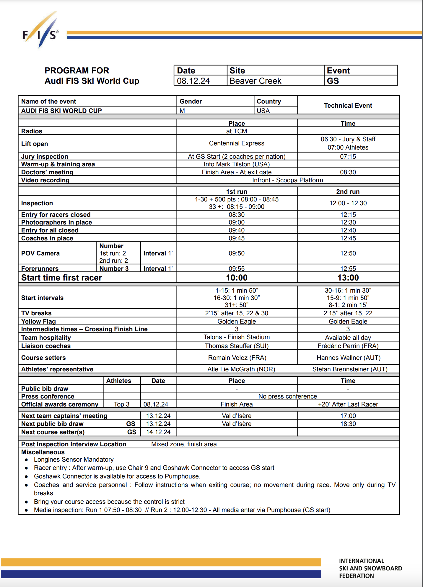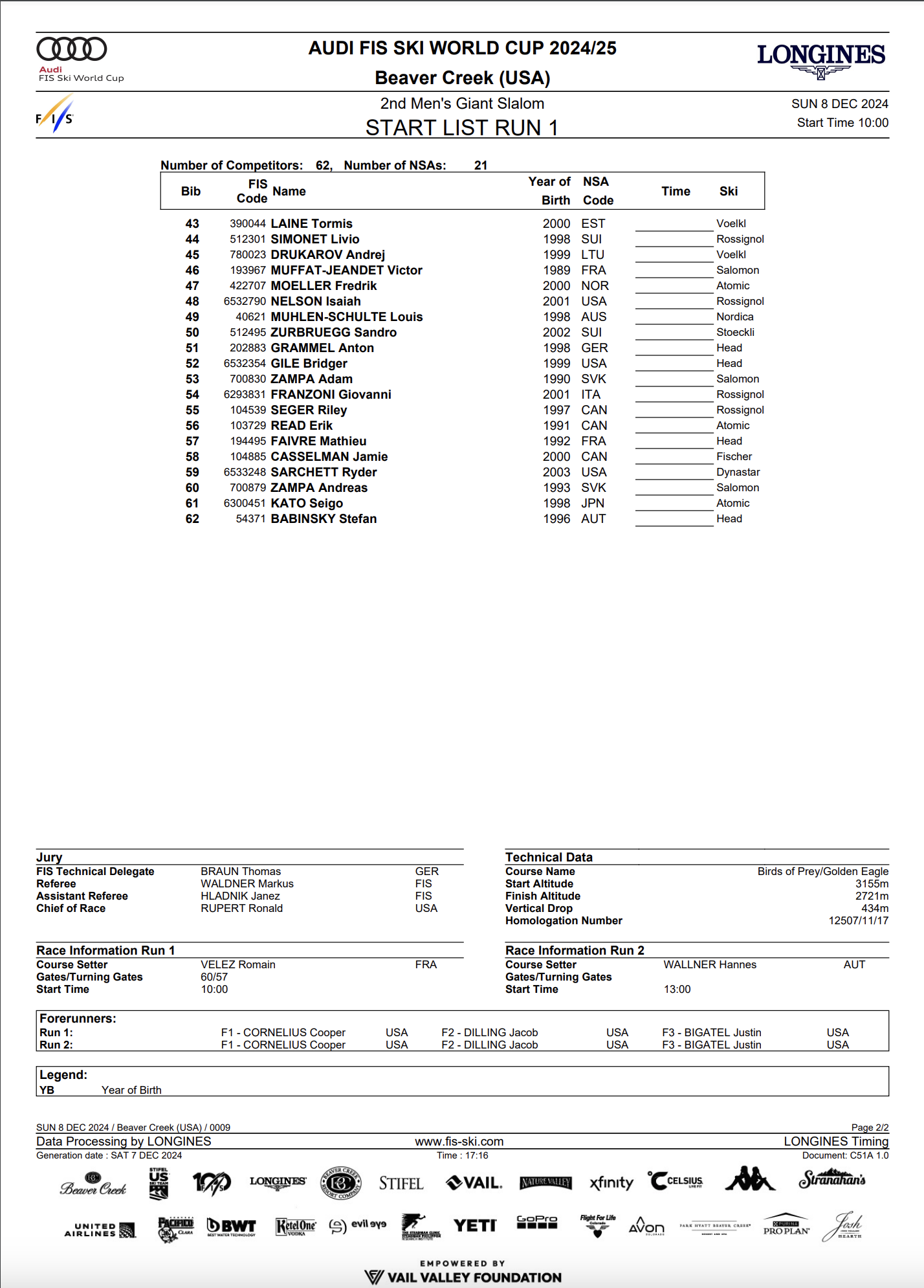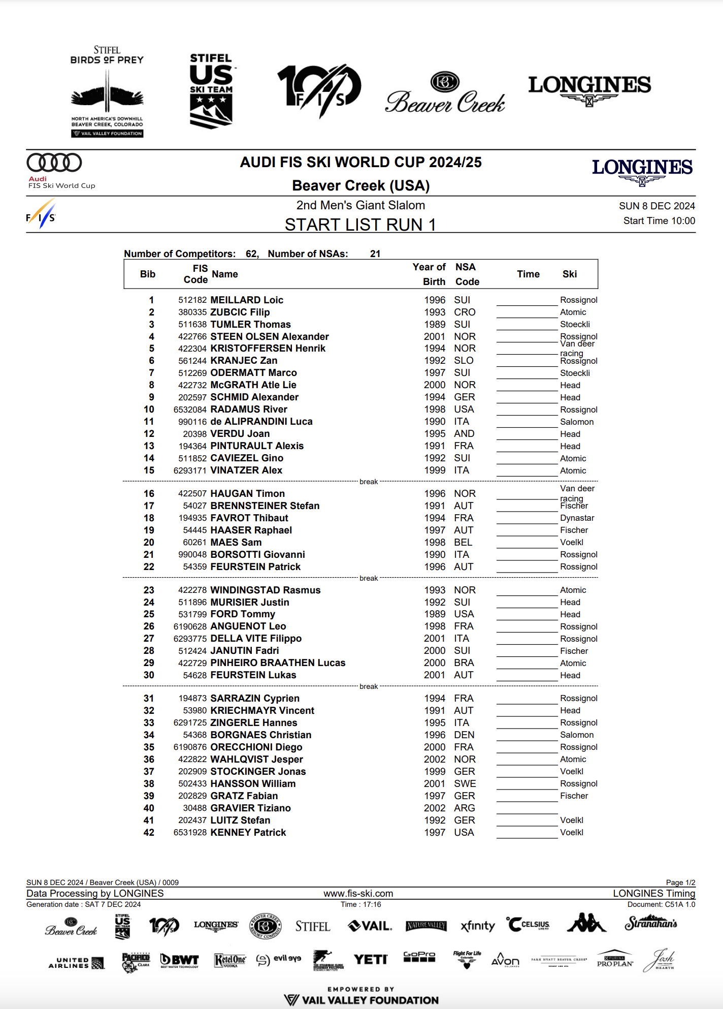 Sixty-two men from 21 nations will start the men’s World Cup GS in Beaver Creek on Dec. 8, with Switzerland leading the field with eight qualified athletes on the start list.