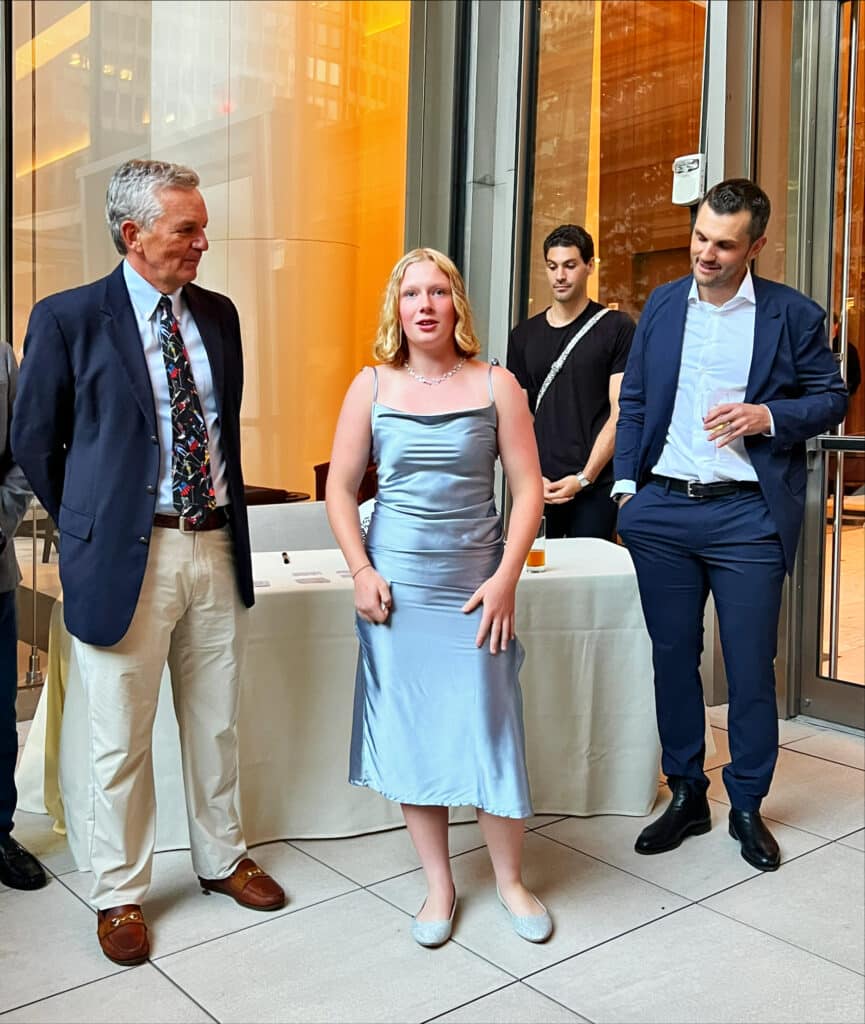 Kenzie recounted several memorable moments at the event, including receiving recognition from her first academy coach, Brian Wyckoff, in front of the audience, receiving a custom helmet from Nina O’Brien, connecting with numerous individuals who share her passion for ski racing, touring the Vanderbilt building, and experiencing an overnight stay in the heart of New York City for the first time.