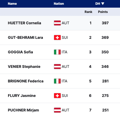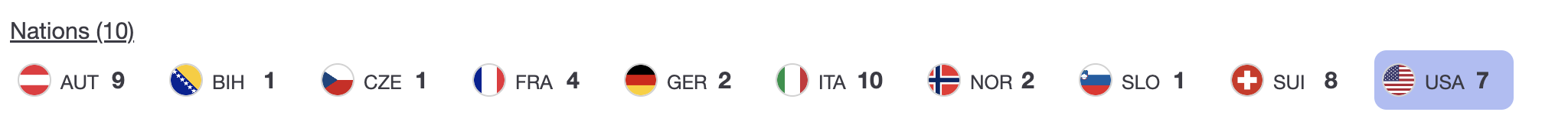 - Switzerland (SUI): 2 wins (Lara Gut-Behrami 1, Jasmine Flury 1)