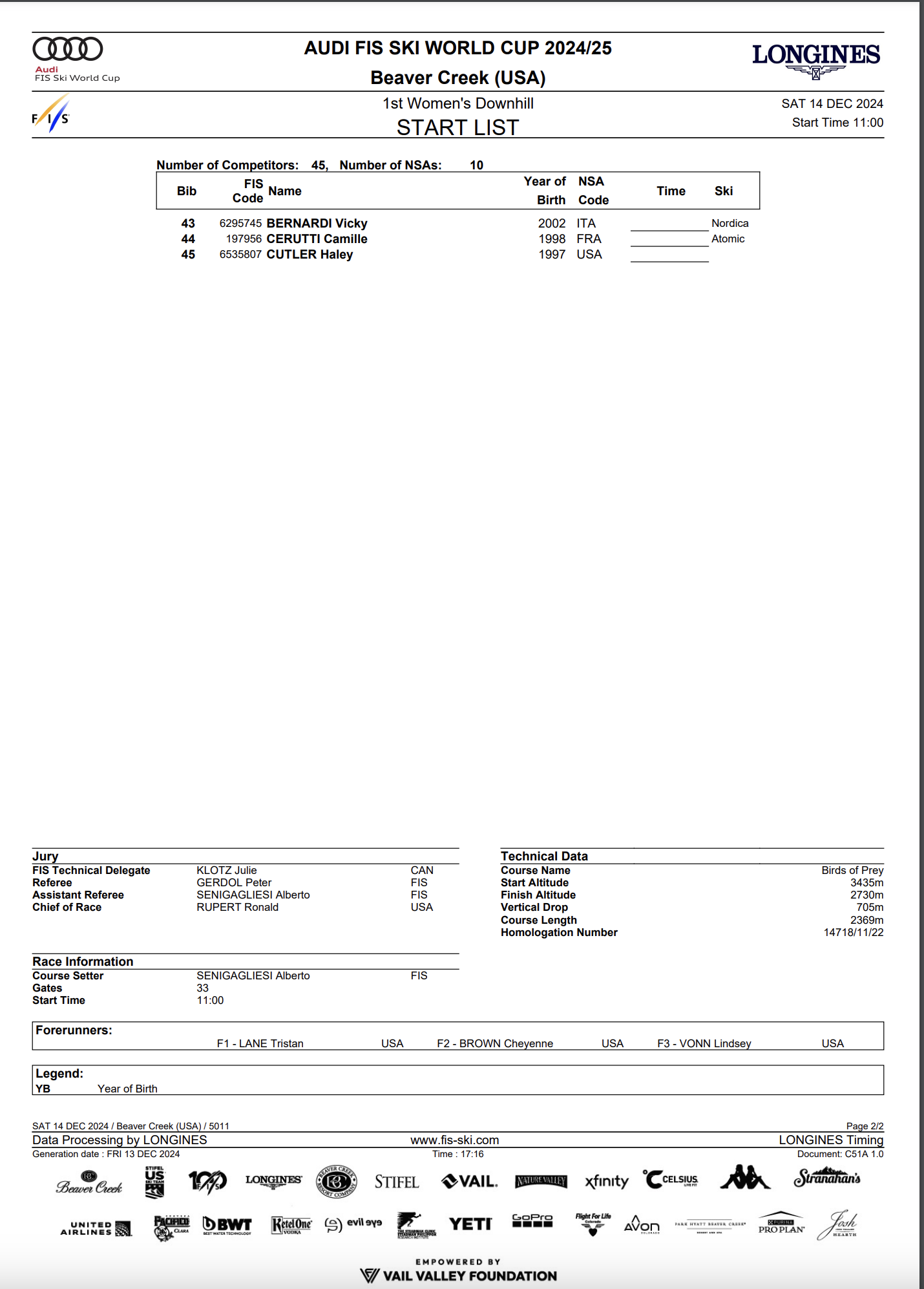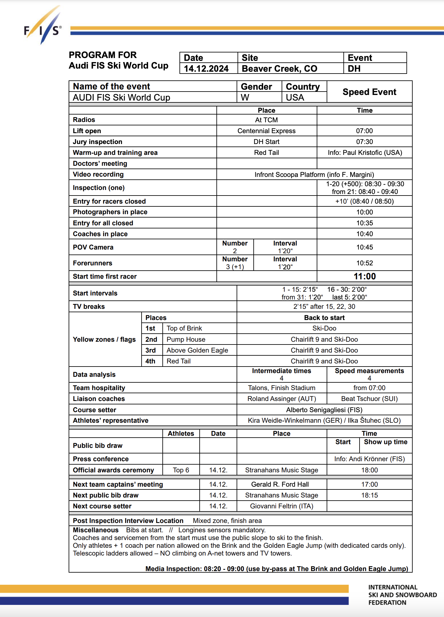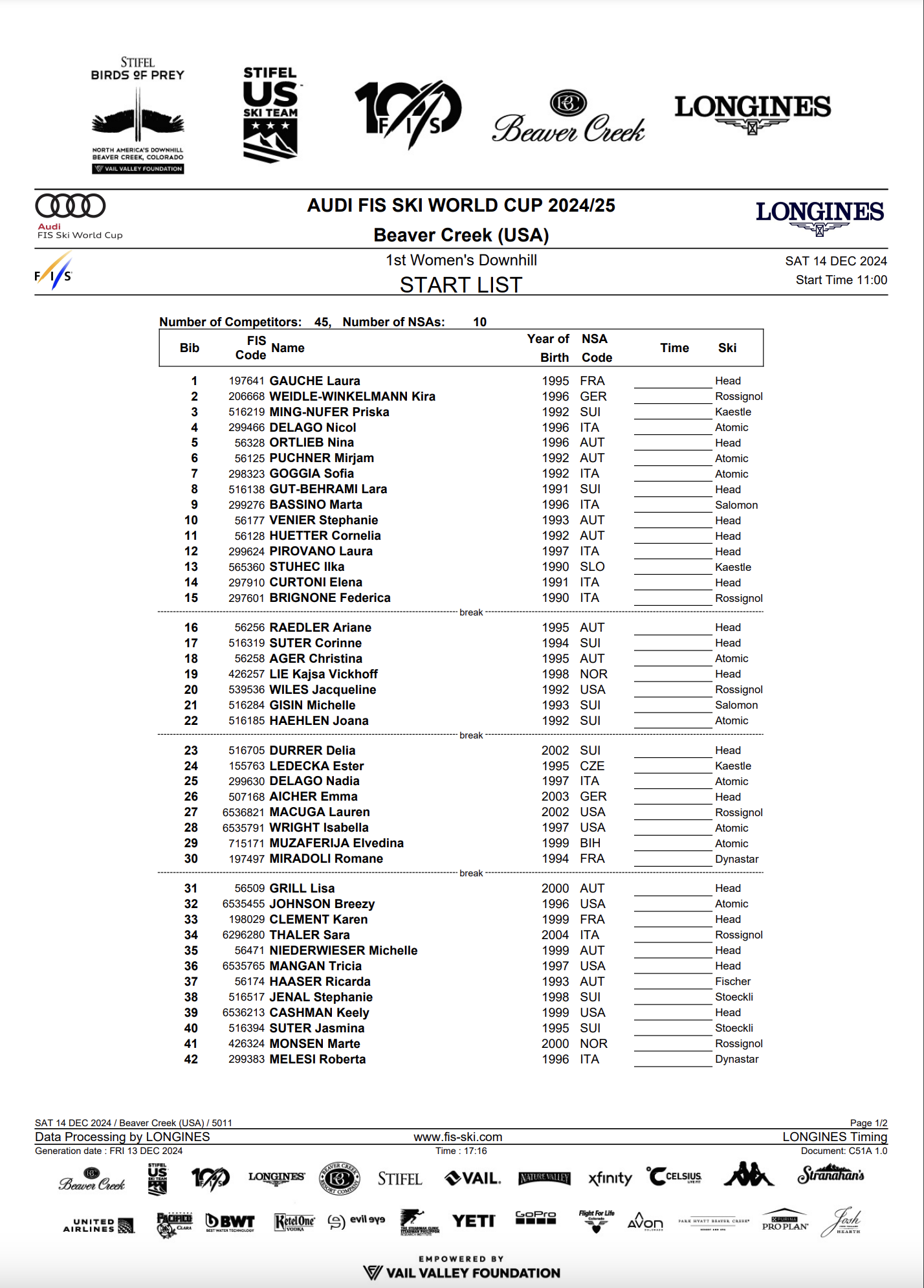 Forty-five athletes from 10 nations will compete in the debut women’s Birds of Prey downhill. Austria leads the start list with nine racers, followed by Switzerland with eight and the United States with seven.