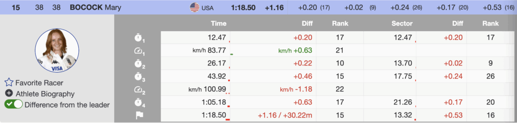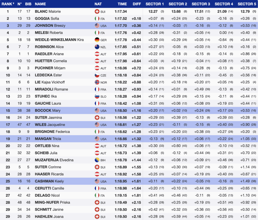 Beyond Johnson’s podium, it was another statement day for the Stifel U.S. Ski Team: five women scored points, a strong performance from a very strong squad. Bocock’s surge was particularly encouraging — only her second points result after the season-opening St. Moritz Super-G (the race that secured her Olympic spot), and she attacked today with unmistakable Olympic energy.