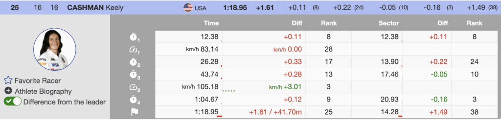 - 25th 🇺🇸 Keely Cashman (USA) — bib 16 — +1.61 — 1999 — Head
