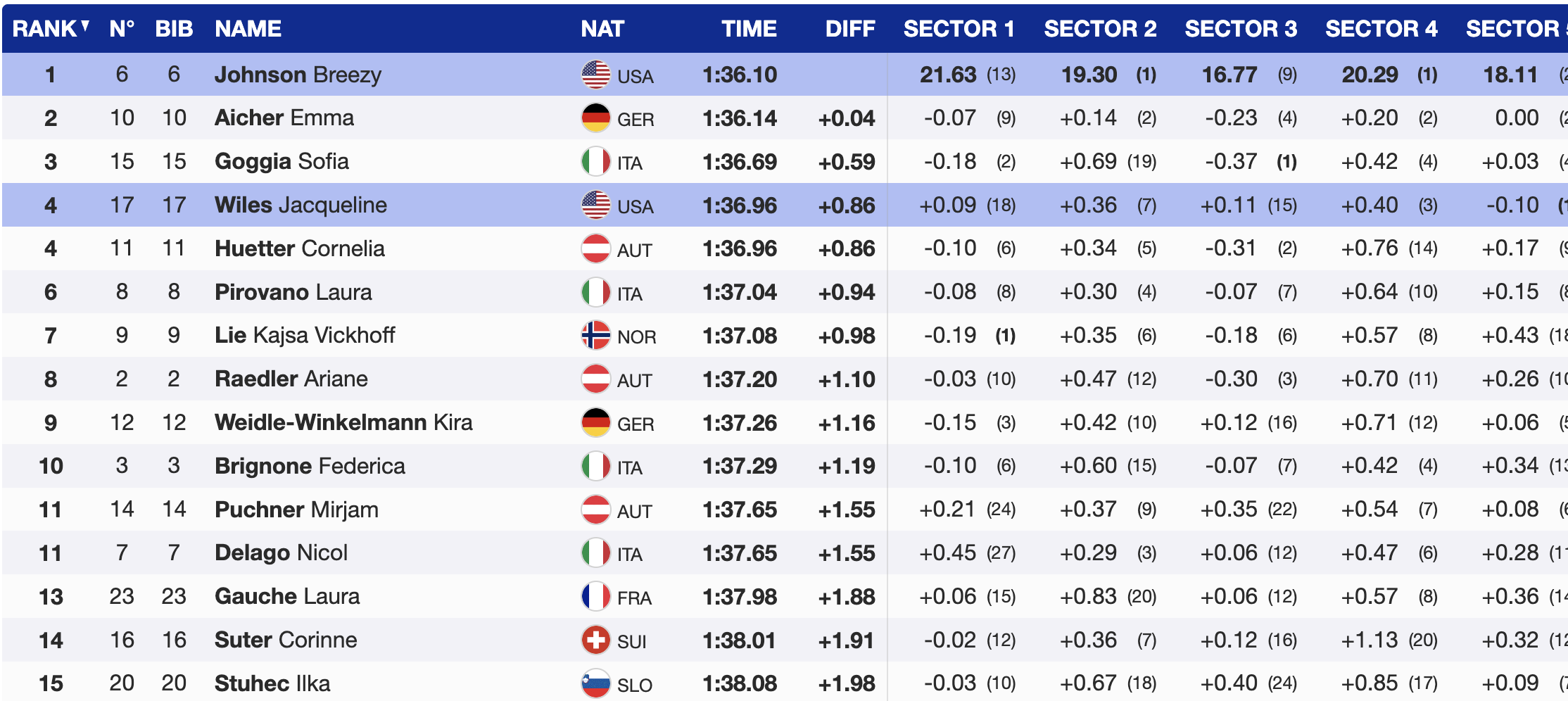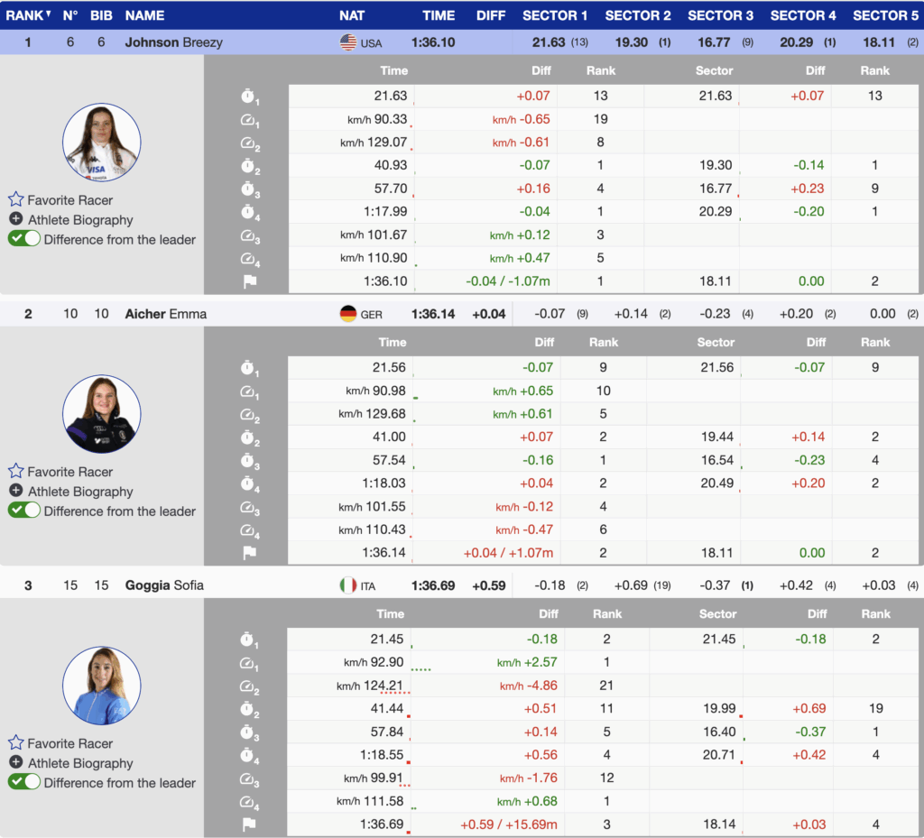 - 🥇 Breezy Johnson (USA) — 1:36.10