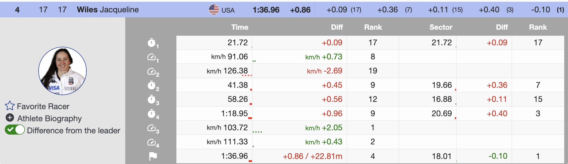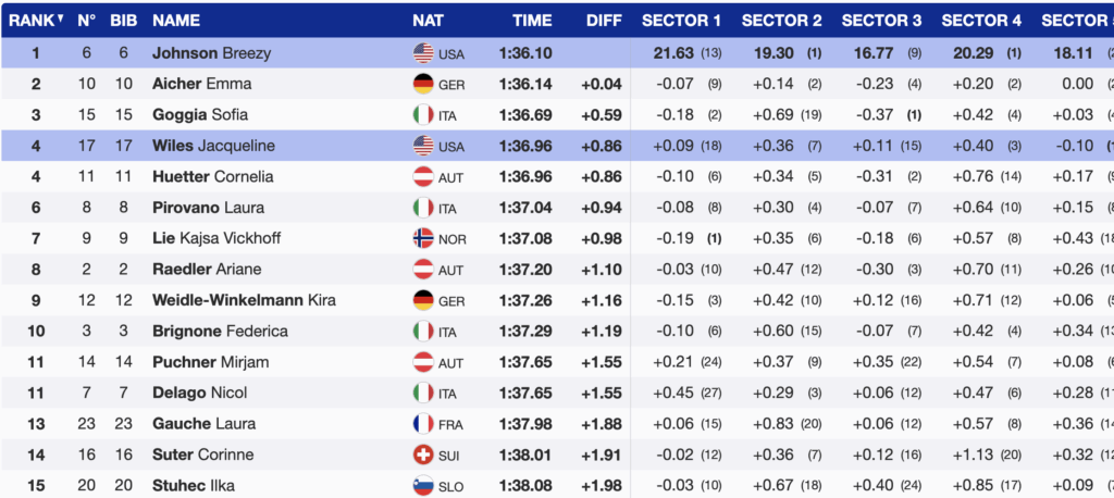 Jacqueline Wiles came agonizingly close to joining Johnson on the podium. Skiing with bib 17, Wiles built her run from the middle of the course down and delivered the fastest final sector of the race, charging hard through the last pitch. Earlier losses, however, proved just enough to keep her off the medals, and she finished fourth, 0.86 seconds back, narrowly behind Goggia’s bronze. It was a powerful, aggressive run that underscored Wiles’ ability to contend on the biggest stage, even if the margins once again fell the wrong way.
