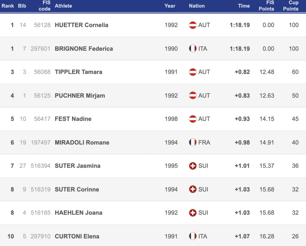 Out of the top 10 skiers in the overall standings, only Brignone, Corinne Suter and Elena Curtoni raced.