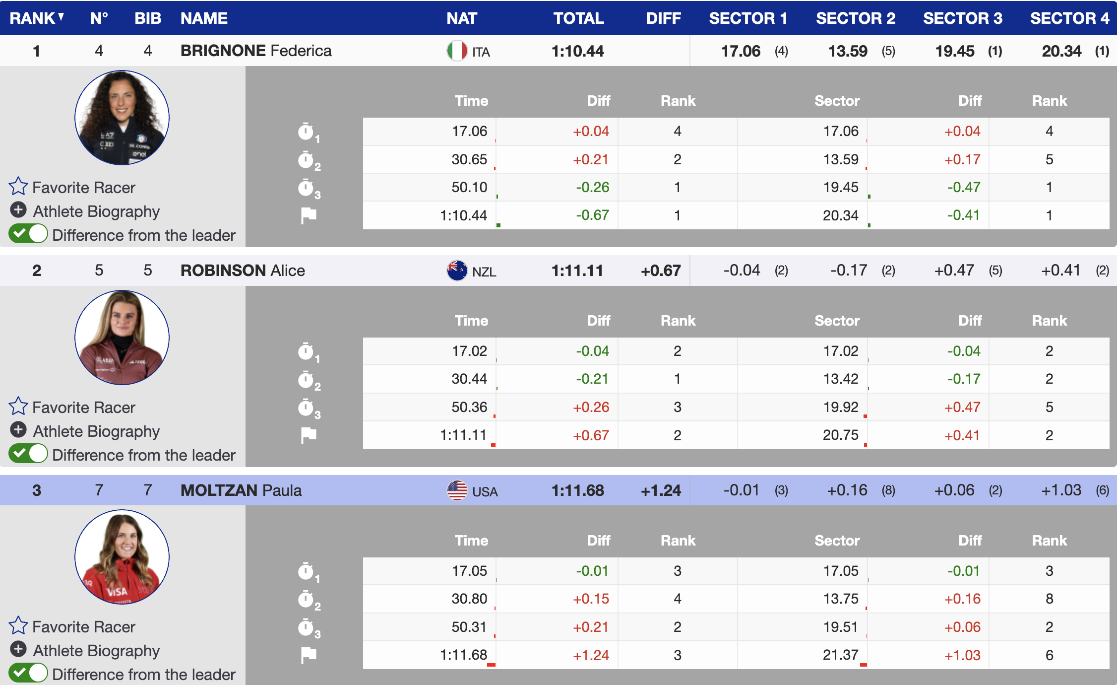 As more racers came down, it became clear that Brignone and Robinson had mastered the course’s toughest sections, maintaining momentum where others struggled. The rest of the field saw considerable time gaps, with many skiers over a second behind the podium positions.