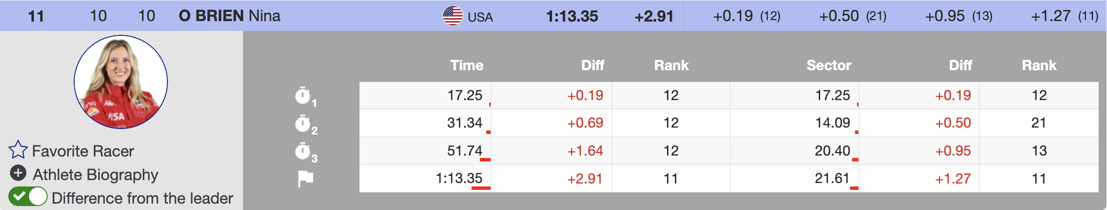 Moltzan stood out as the top North American, sitting in third place at 1.24 seconds back. Her teammate Nina O’Brien skied into 11th place, finishing 2.91 seconds off the lead. AJ Hurt landed in 15th, trailing by 3.33 seconds.
