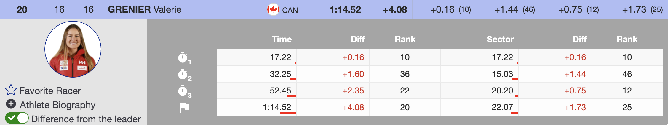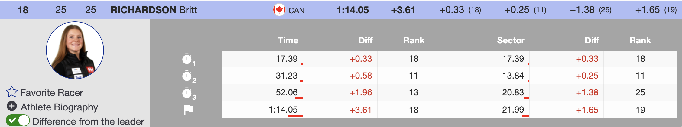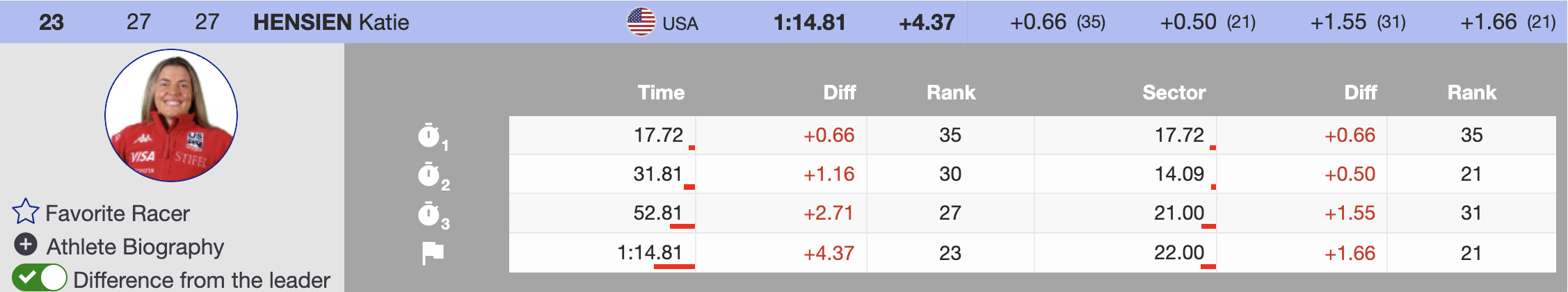 Canada’s Britt Richardson fought to 18th place, overcoming the course’s challenges but finishing with a 3.61-second deficit. Valérie Grenier pushed hard but placed 20th, ending 4.08 seconds behind. Stifel U.S. Ski Team’s Katie Hensien also struggled with the demanding set, crossing the line 4.37 seconds back in 23rd.
