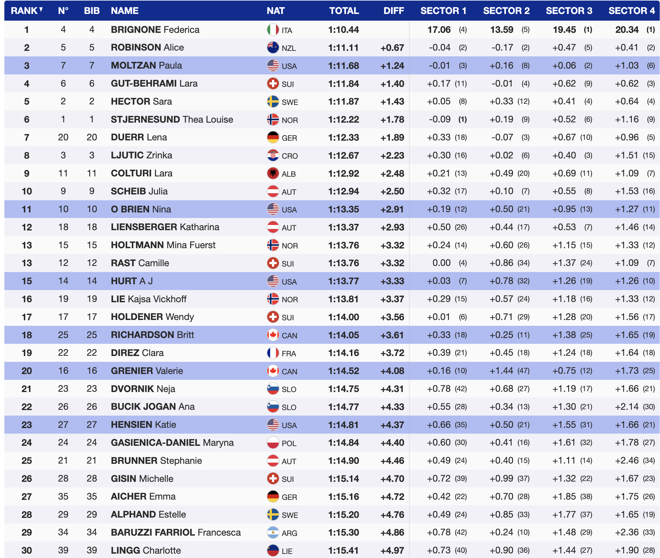 Moltzan stood out as the top North American, sitting in third place at 1.24 seconds back. Her teammate Nina O’Brien skied into 11th place, finishing 2.91 seconds off the lead. AJ Hurt landed in 15th, trailing by 3.33 seconds.