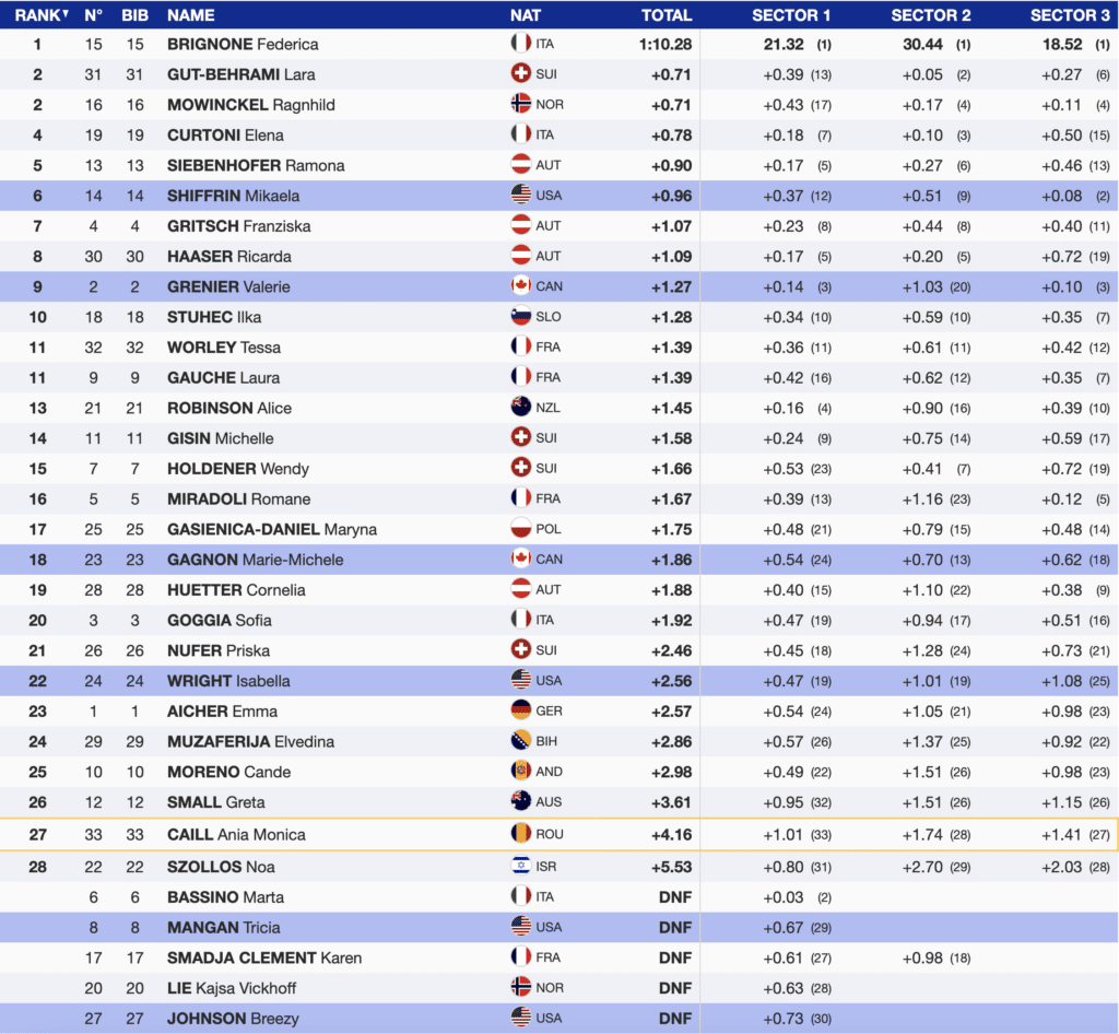 Birgnone, the Italian rocket skiing with bib 15, will enter the combined slalom with the fastest first run super-G time. She could ski with a commitment to the arc and an aggressive line. Brigone will take a (-0.71) over 2nd place Norwegian Ragnhild Mowinckel into the slalom. Matching Mowinckel was Switzerland’s Lara Gut-Behrami but she used the day only to test her skills on the super-G course and will not compete in the afternoon slalom.